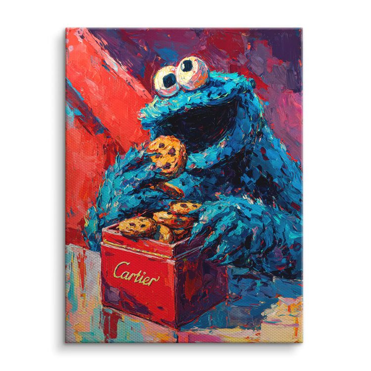 Cookie Couture von ArtMind ist ein ausdrucksstarkes Fine Art Wandbild, das verspielte Pop Art Energie mit luxuriöser Symbolik verbindet. Eine ikonische blaue Figur genießt genussvoll Kekse aus einer edlen Schmuckbox und steht damit sinnbildlich für modernen Lifestyle, Genuss und selbstironischen Luxus. Die kraftvolle Farbpalette aus leuchtendem Rot, tiefem Blau und dynamischen Pinselstrukturen verleiht dem Kunstwerk eine intensive Tiefe und starke emotionale Wirkung. Dieses Wandbild bringt Humor, Stilbewusstsein und kreative Freiheit in jeden Raum und setzt ein klares Statement für Individualität und zeitgenössische Kunst.