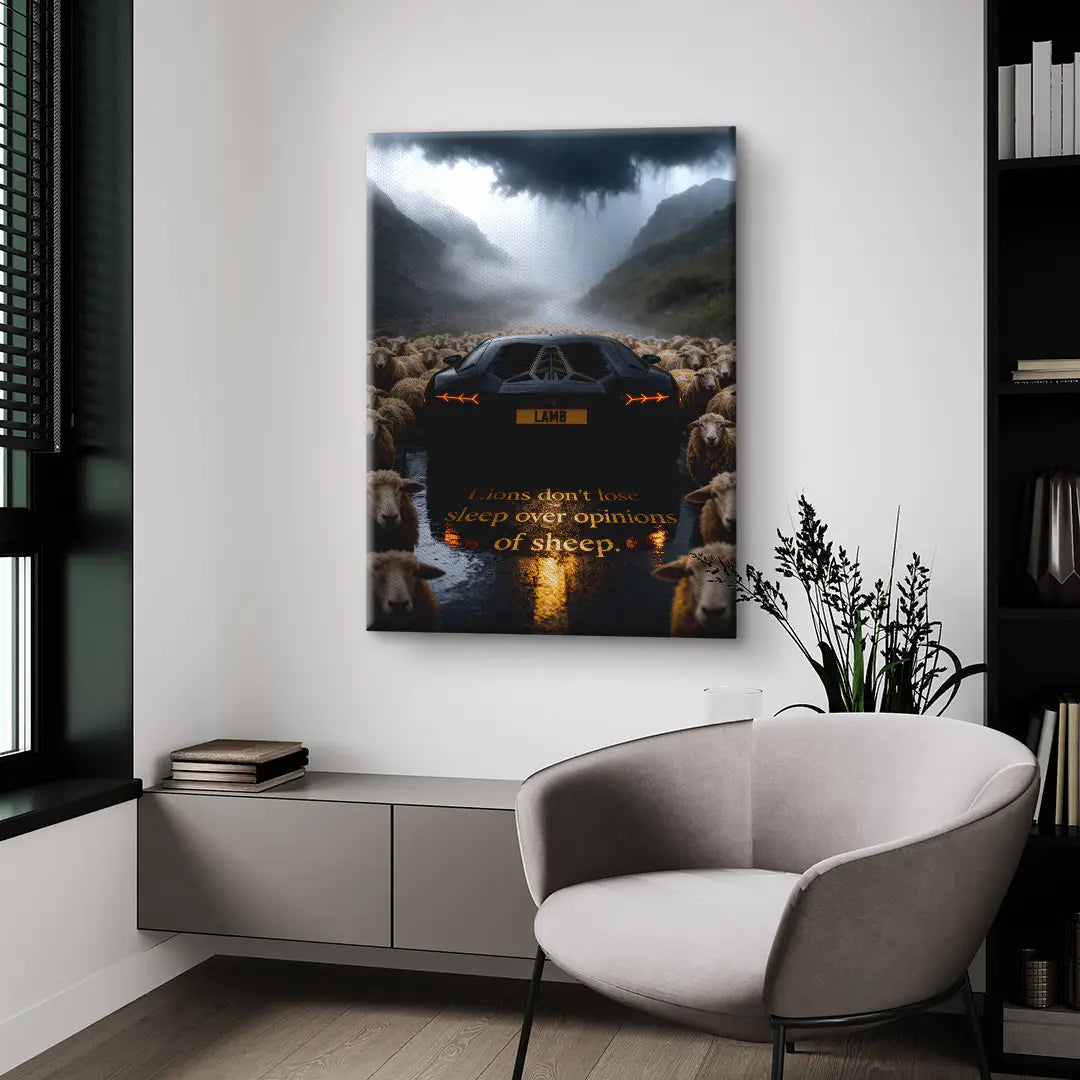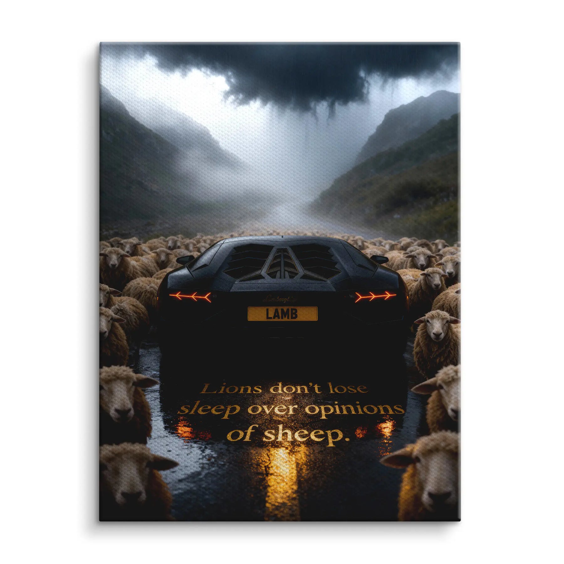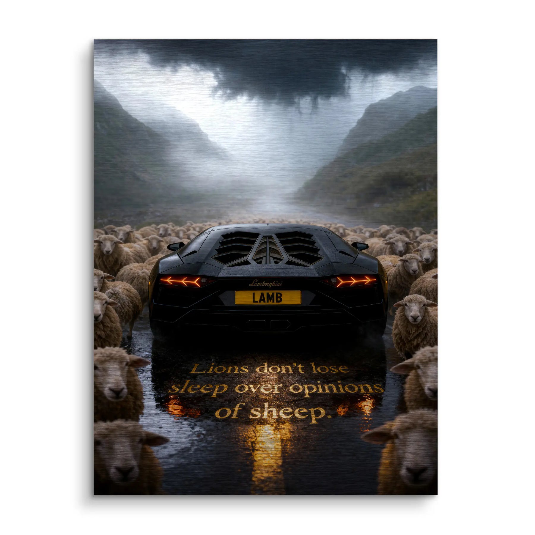 Above Opinions von Egzon Muliqi ist ein kraftvolles Fine Art Wandbild, das Selbstbewusstsein, Stärke und kompromisslose Entschlossenheit visuell inszeniert. Im Zentrum steht ein dunkler Supersportwagen, umgeben von einer Herde Schafe in einer dramatischen Berglandschaft unter schwerem Himmel. Die nasse Straße reflektiert das Licht der Rücklichter und verstärkt die intensive Atmosphäre. Das prägnante Statement Lions don’t lose sleep over opinions of sheep bringt die Botschaft klar auf den Punkt und macht dieses Kunstwerk zu einem Symbol für Fokus und innere Überzeugung. Dieses ArtMind Kunstwerk steht für Führung, Mut und die Fähigkeit, seinen eigenen Weg zu gehen, unabhängig von äußeren Stimmen. Als limitierte Edition setzt Above Opinions ein ausdrucksstarkes Zeichen in deinem Wohnzimmer, Büro oder Home Office und verbindet moderne Fine Art Ästhetik mit einer inspirierenden Haltung.