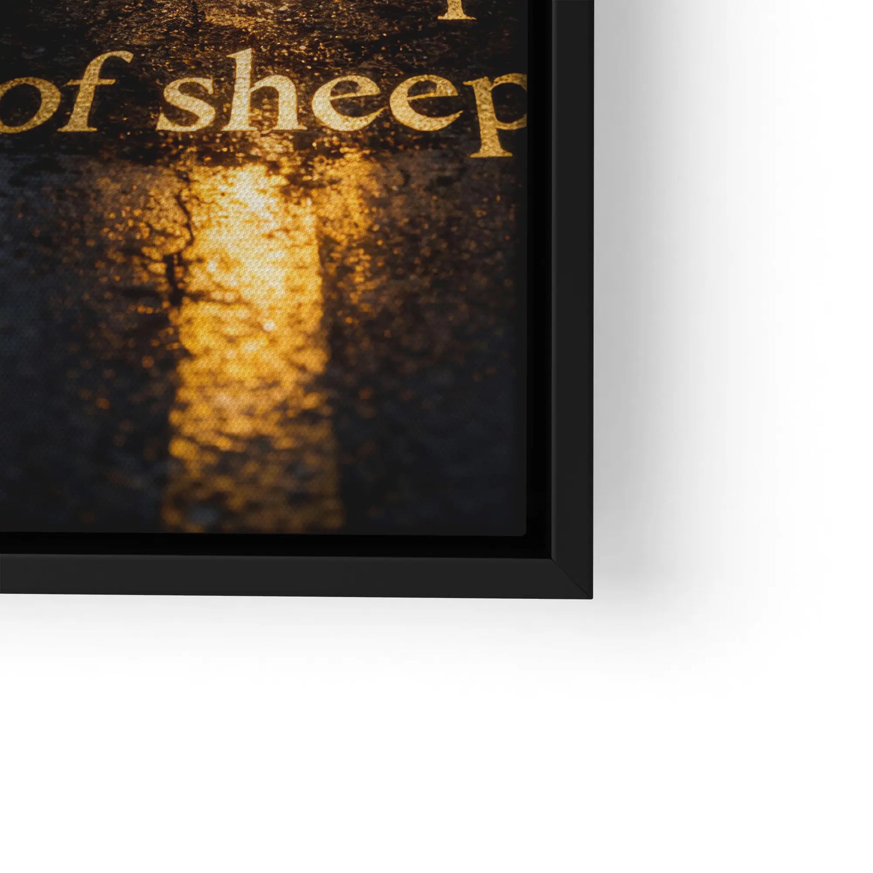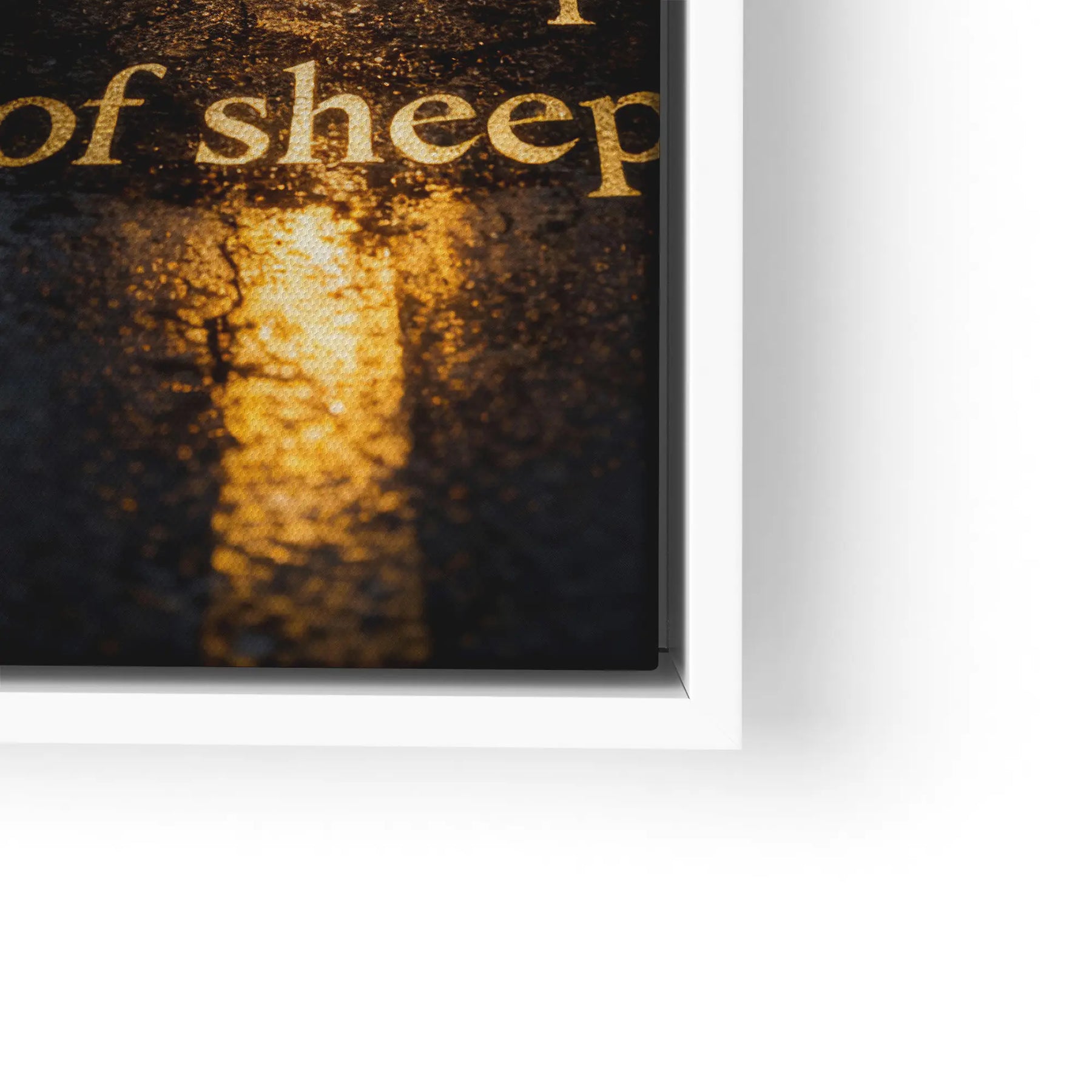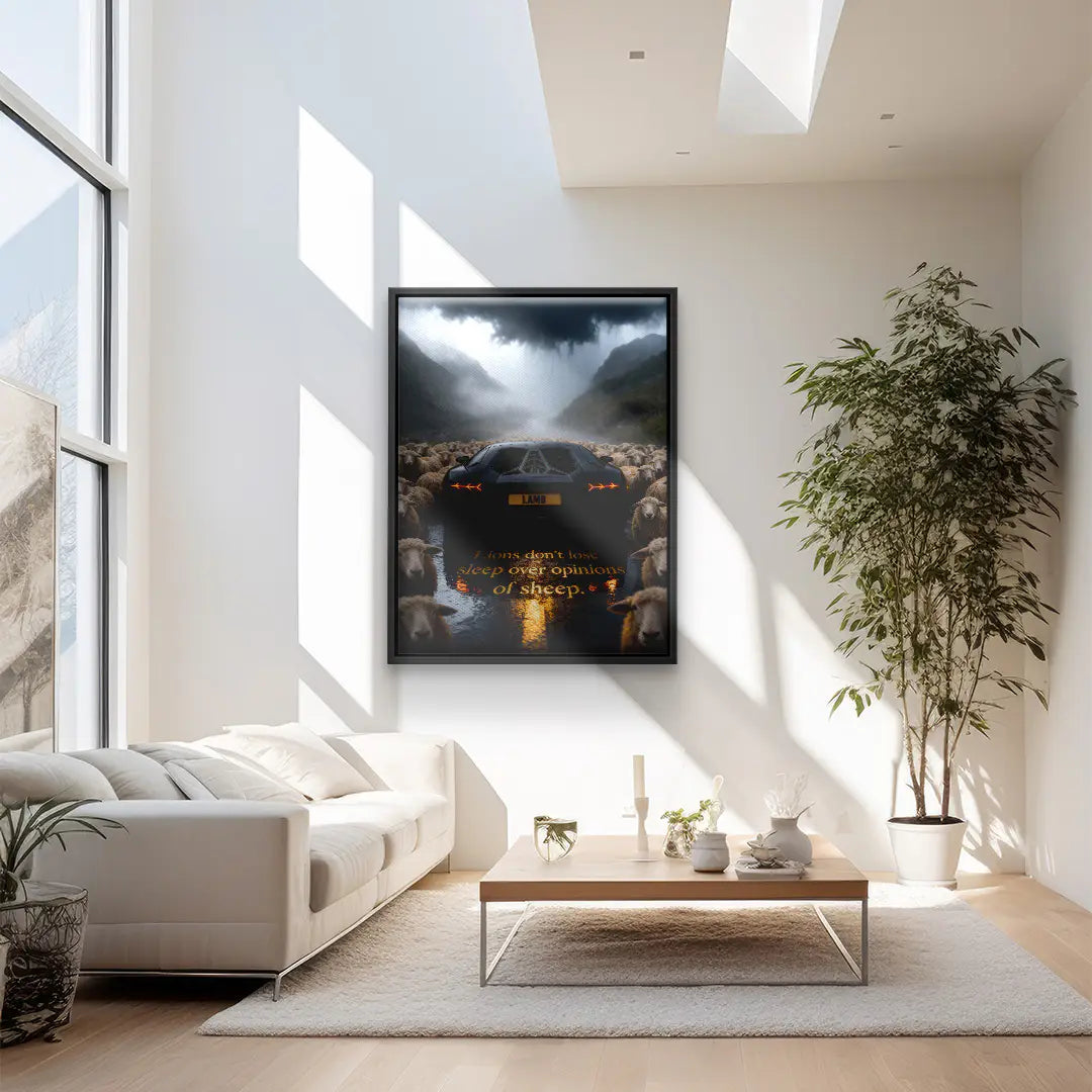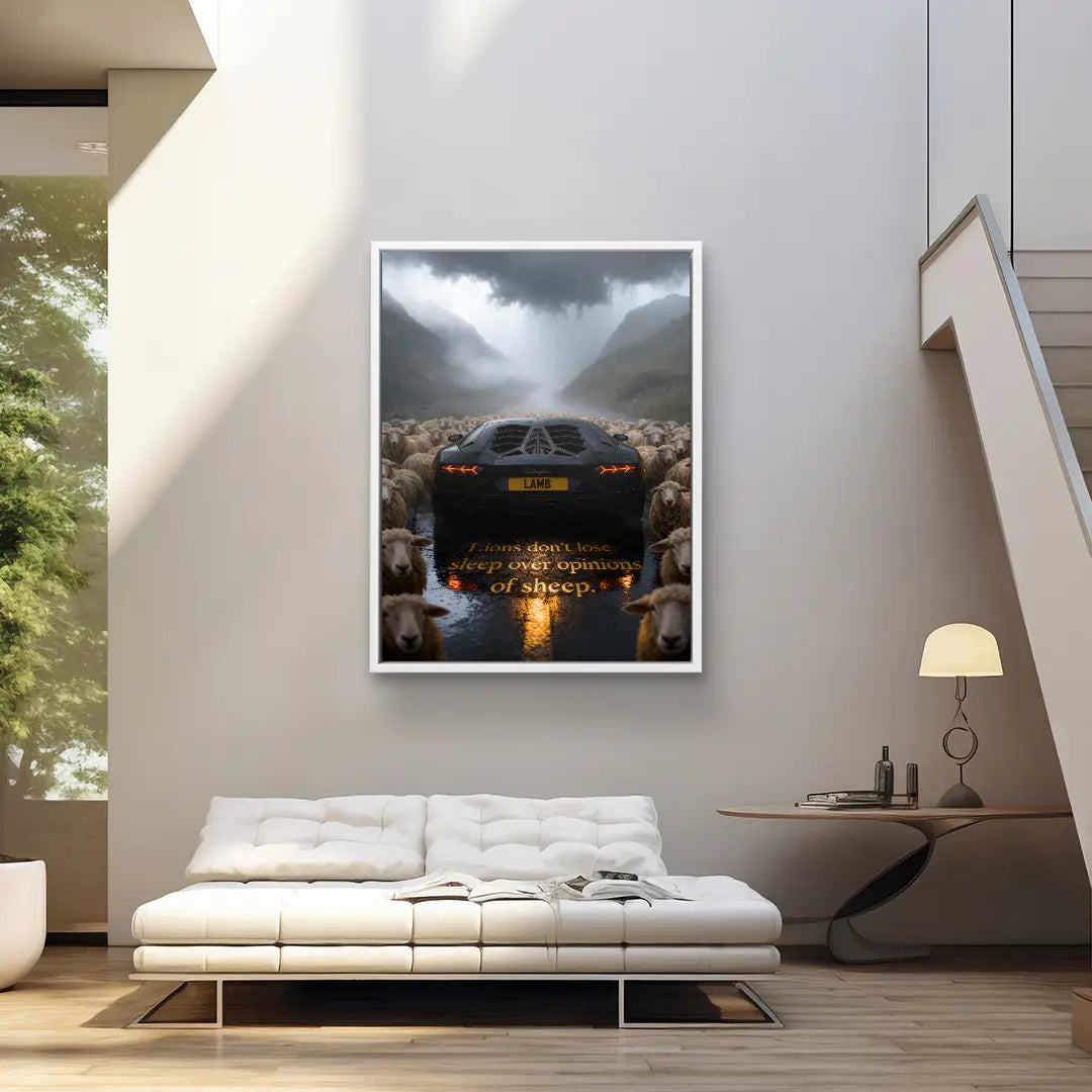Above Opinions von Egzon Muliqi ist ein kraftvolles Fine Art Wandbild, das Selbstbewusstsein, Stärke und kompromisslose Entschlossenheit visuell inszeniert. Im Zentrum steht ein dunkler Supersportwagen, umgeben von einer Herde Schafe in einer dramatischen Berglandschaft unter schwerem Himmel. Die nasse Straße reflektiert das Licht der Rücklichter und verstärkt die intensive Atmosphäre. Das prägnante Statement Lions don’t lose sleep over opinions of sheep bringt die Botschaft klar auf den Punkt und macht dieses Kunstwerk zu einem Symbol für Fokus und innere Überzeugung. Dieses ArtMind Kunstwerk steht für Führung, Mut und die Fähigkeit, seinen eigenen Weg zu gehen, unabhängig von äußeren Stimmen. Als limitierte Edition setzt Above Opinions ein ausdrucksstarkes Zeichen in deinem Wohnzimmer, Büro oder Home Office und verbindet moderne Fine Art Ästhetik mit einer inspirierenden Haltung.