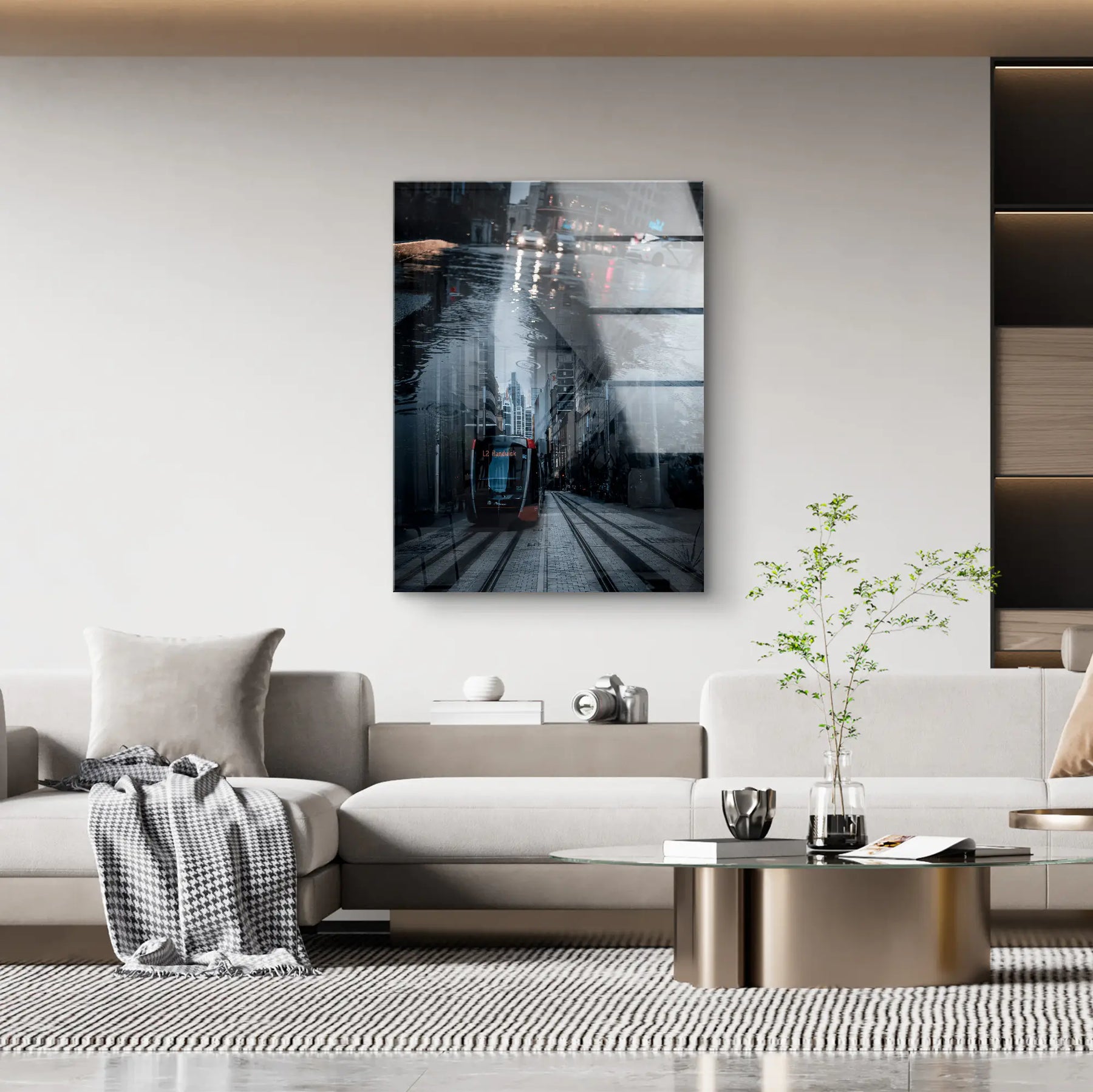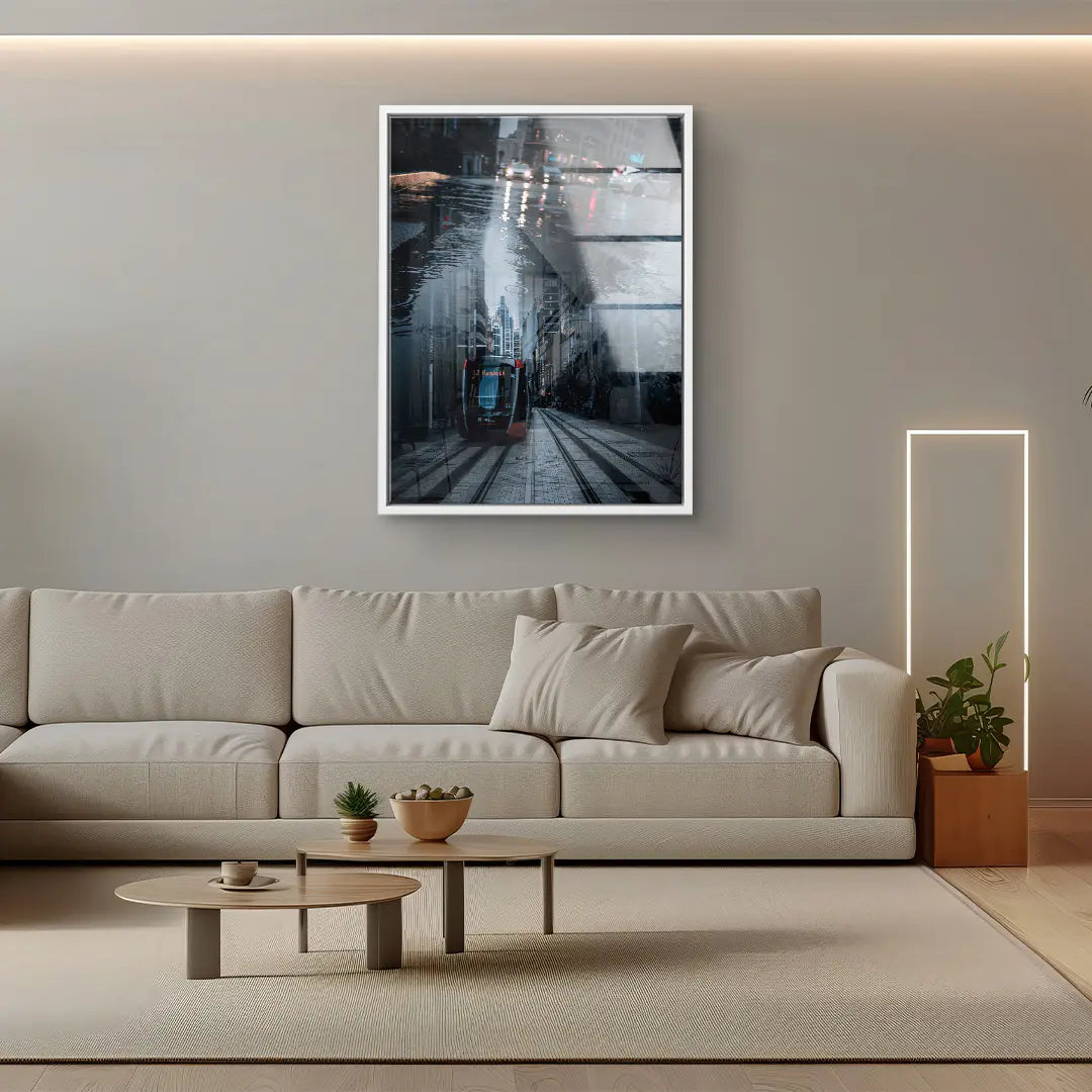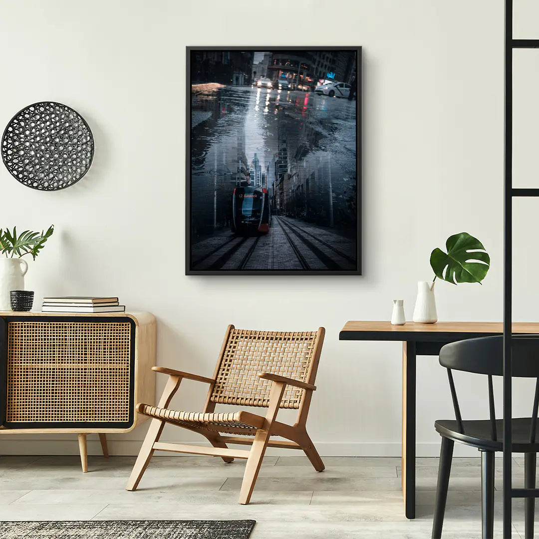 City Echo von Egzon Muliqi ist ein atmosphärisches Fine Art Wandbild, das urbane Dynamik und stille Reflexion in einer eindrucksvollen Komposition vereint. Eine regennasse Straße spiegelt die Skyline der Stadt wider und erschafft eine zweite, verborgene Realität im Wasser. Während oberhalb Lichter, Autos und Großstadtleben pulsieren, entsteht darunter eine ruhige, fast mystische Perspektive mit einer Straßenbahn, die ihren Weg durch enge Häuserschluchten zieht. Das Spiel aus Licht, Spiegelung und Tiefe erzeugt eine cineastische Stimmung und symbolisiert die Dualität moderner Städte – Hektik und Stille, Oberfläche und Tiefe, Realität und Echo. Die kühlen Blautöne und starken Kontraste verleihen dem Motiv eine moderne, urbane Eleganz. Als ArtMind Kunstwerk bringt City Echo metropolitanen Charakter und zeitlose Ästhetik in dein Wohnzimmer, Büro oder Loft. Eine limitierte Edition für alle, die die Energie der Stadt lieben und gleichzeitig ihre verborgenen Geschichten entdecken möchten.