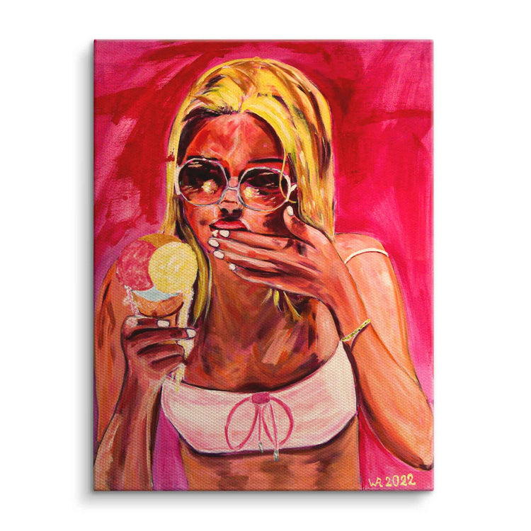 Young woman enjoying an ice cream and watching the hustle and bustle on the beach, enjoying the summer feeling to the fullest. The artist works here with acrylic paints that are applied in several layers. This creates the extraordinary effects in the colors of ice cream.