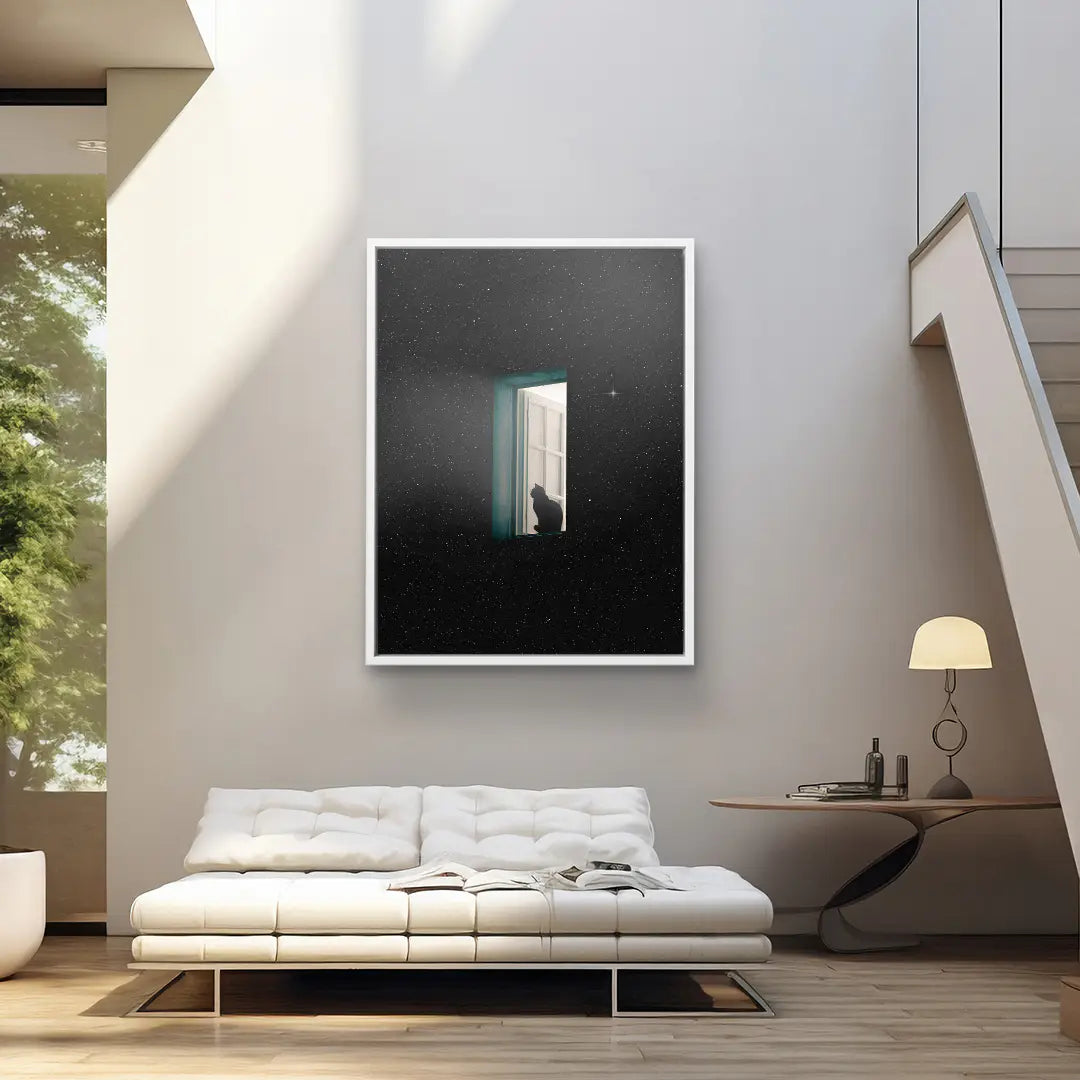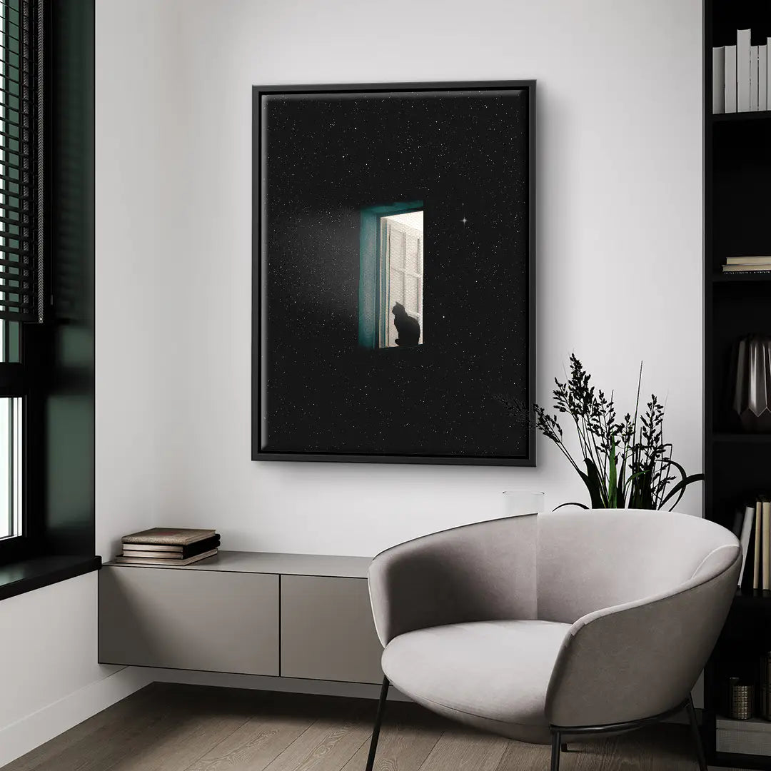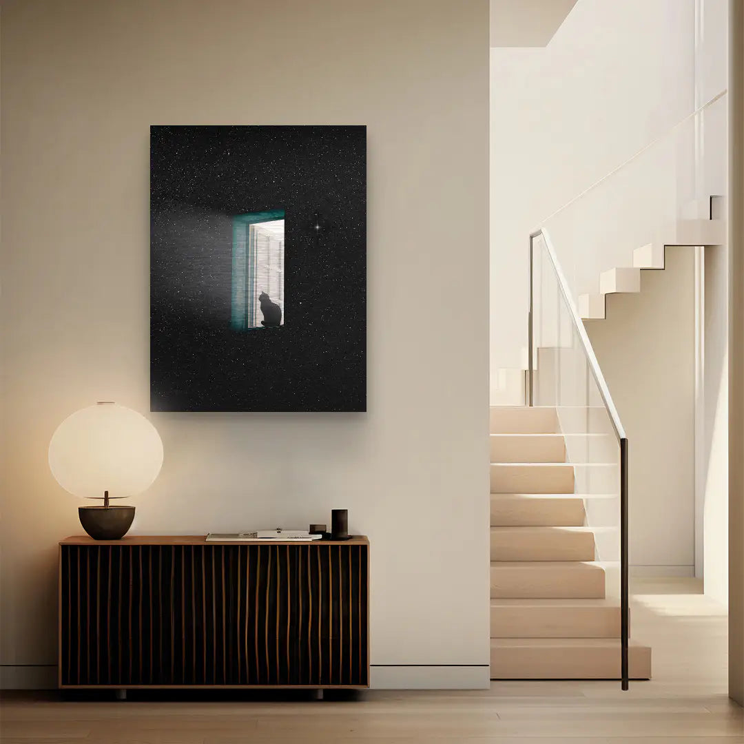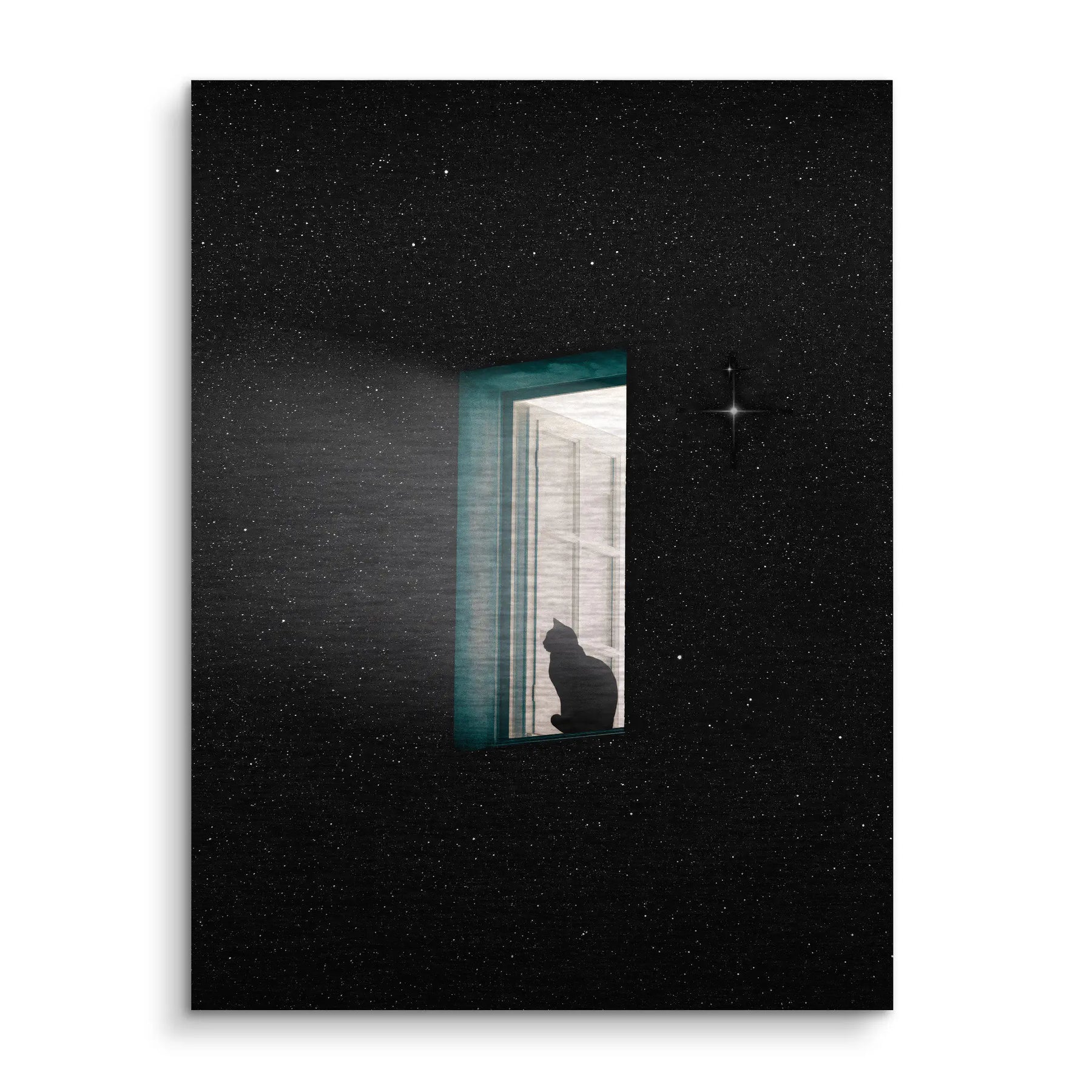 Midnight watch von Egzon Muliqi ist ein poetisches Fine Art Wandbild, das Stille, Sehnsucht und nächtliche Magie in einer minimalistischen Komposition vereint. Inmitten eines endlosen Sternenhimmels öffnet sich ein einzelnes Fenster, aus dem sanftes Licht in die Dunkelheit strahlt. Auf der Fensterbank sitzt die Silhouette einer Katze und blickt aufmerksam hinaus in die Weite des Universums. Der starke Kontrast zwischen tiefem Schwarz und hellem Licht erzeugt eine ruhige, fast meditative Atmosphäre. Dieses Kunstwerk steht für Neugier, innere Einkehr und die besonderen Gedanken, die nur die Nacht hervorbringt. Als ArtMind Kunstwerk bringt Midnight watch eine elegante, moderne Ruhe in dein Zuhause oder Büro und setzt ein stilvolles Statement zwischen Minimalismus und kosmischer Tiefe. Eine limitierte Edition für alle, die stille Momente und ästhetische Klarheit schätzen.