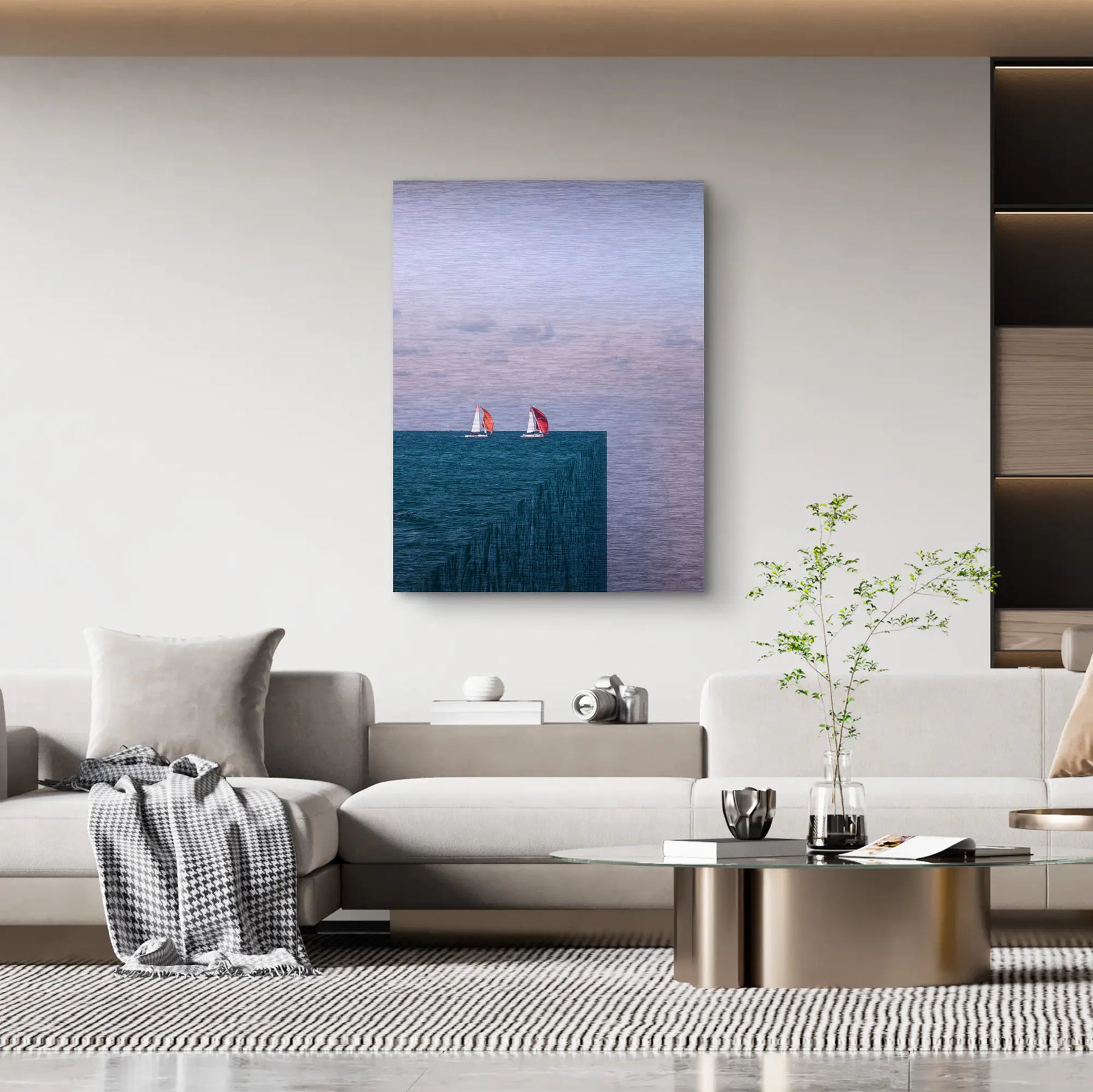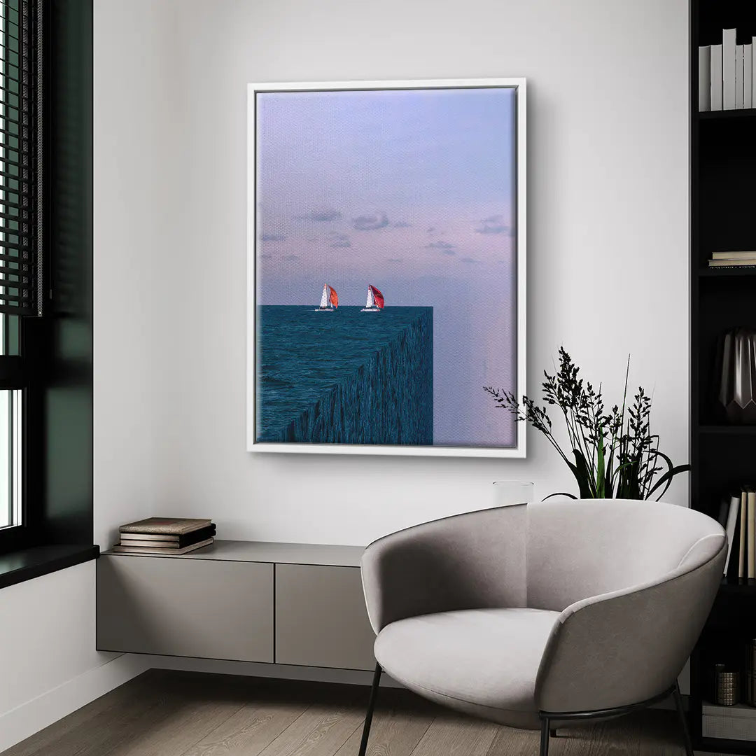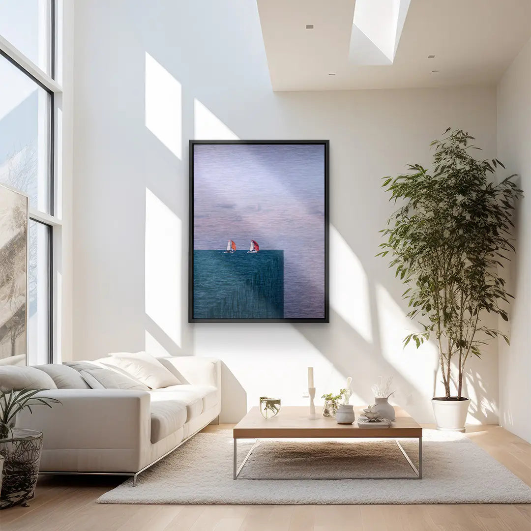 Ocean Cut von Egzon Muliqi ist ein minimalistisches Fine Art Wandbild, das Realität und Illusion in einer klaren, surrealen Komposition vereint. Zwei Segelboote gleiten ruhig über das Meer – doch die Wasserfläche endet abrupt an einer scharf geschnittenen Kante, als wäre der Ozean ein geometrischer Block im Raum. Diese unerwartete Perspektive erzeugt ein Gefühl von Unendlichkeit und gleichzeitig von Begrenzung. Das Werk spielt mit Wahrnehmung, Balance und dem Mut, auch am Rand weiterzusegeln. Die kühlen Blautöne des Meeres treffen auf einen sanften Pastellhimmel und schaffen eine ruhige, fast meditative Atmosphäre. Die roten Segel setzen dabei einen gezielten Akzent und verleihen dem Motiv Dynamik und Hoffnung. Als ArtMind Kunstwerk bringt Ocean Cut moderne Klarheit und tiefgründige Symbolik in dein Zuhause, Büro oder Loft. Eine limitierte Edition für alle, die über den Horizont hinausdenken und neue Perspektiven wagen.
