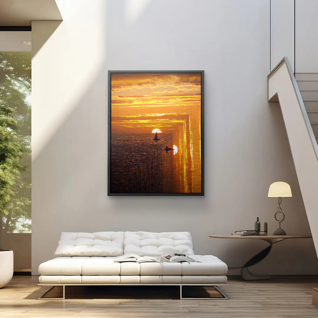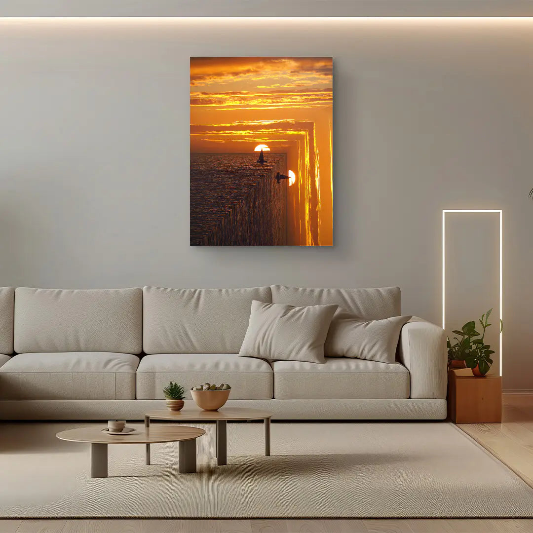 Sunset Sail von Egzon Muliqi ist ein eindrucksvolles Fine Art Wandbild, das die Magie eines Sonnenuntergangs mit surrealer Tiefe verbindet. Ein einzelnes Segelboot gleitet ruhig über das Meer, während die untergehende Sonne den Horizont in leuchtendes Gold und intensives Orange taucht. Doch das Wasser endet nicht am Horizont – es bricht wie eine geometrische Kante in die Tiefe und erschafft eine faszinierende, endlose Spiegelung des Moments. Dieses Spiel aus Perspektive, Licht und Struktur symbolisiert Freiheit, Mut und die Reise ins Unbekannte. Die warmen Farben verleihen dem Motiv eine kraftvolle, zugleich beruhigende Atmosphäre und machen es zu einem starken visuellen Statement. Als ArtMind Kunstwerk bringt Sunset Sail Wärme, Weite und Inspiration in dein Wohnzimmer, Büro oder Schlafzimmer. Eine limitierte Edition für alle, die Horizonte nicht als Grenze, sondern als Einladung verstehen.