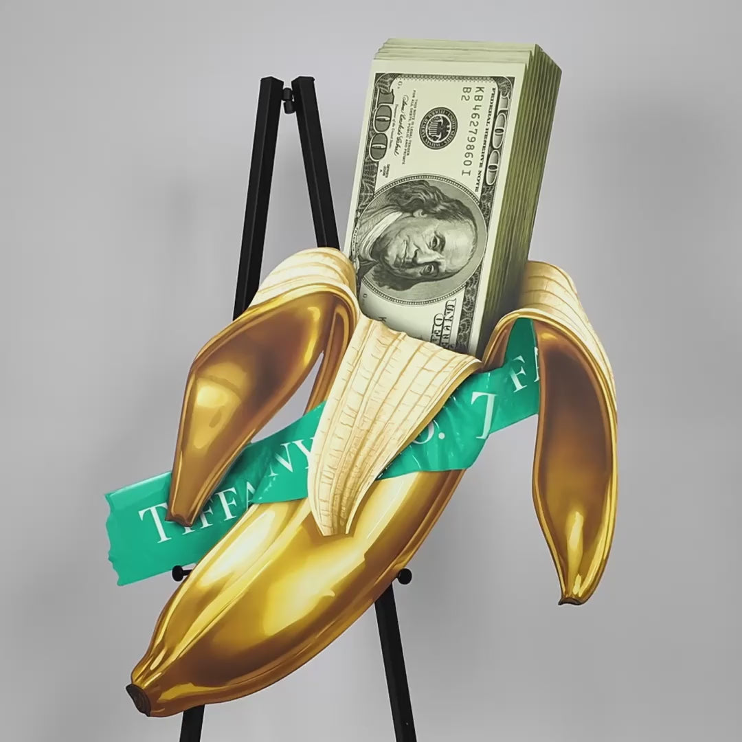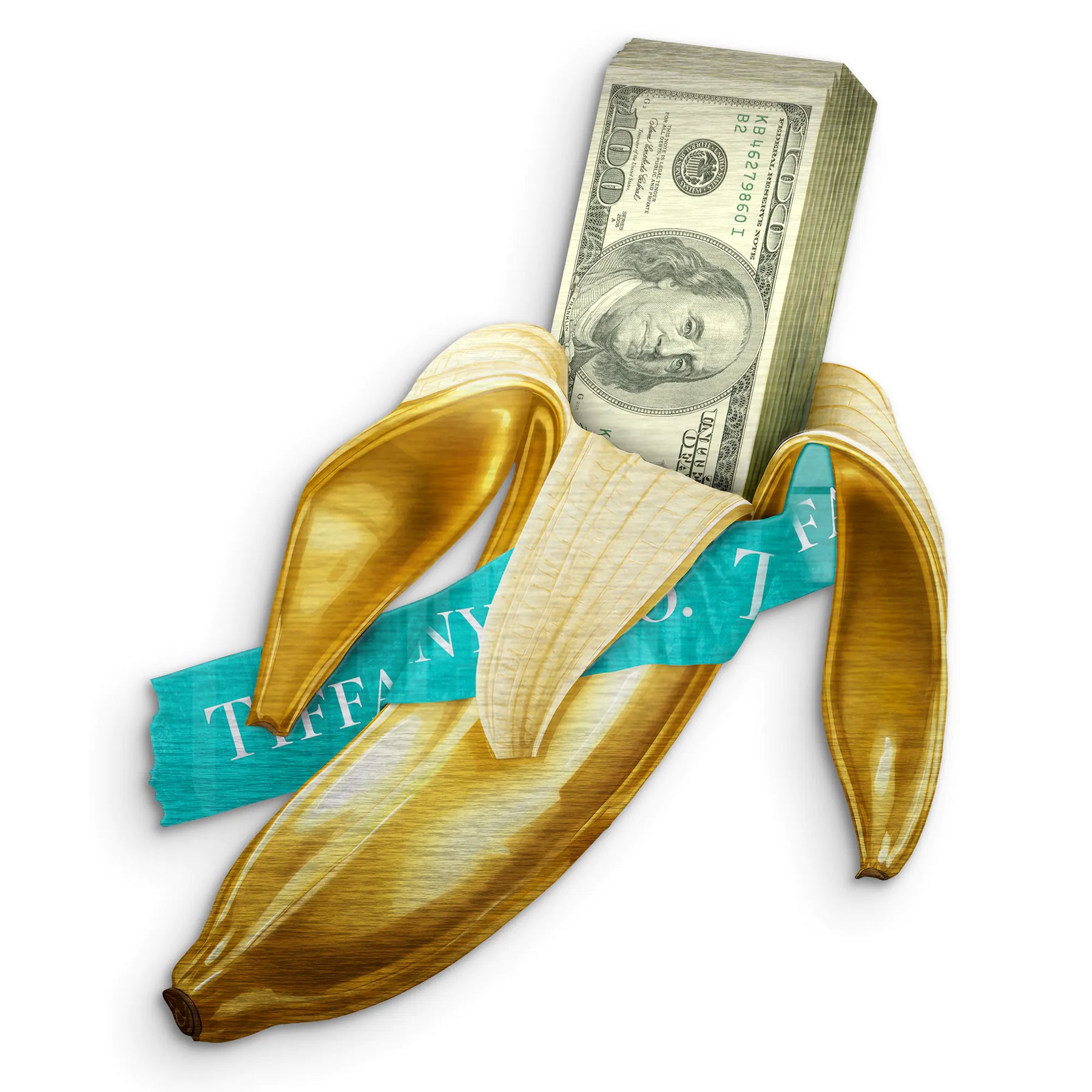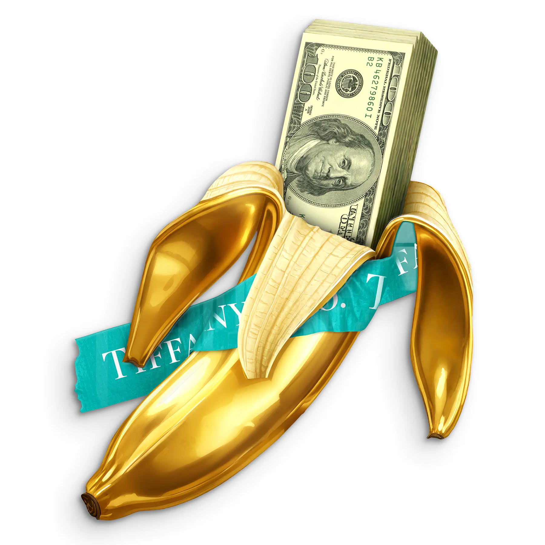 Petrol, Gold und der Duft von Geldscheinen. Eine goldene Banane, halb aufgebrochen, gibt ein dickes Bündel Hundertdollarnoten frei. Was sie zusammenhält: ein Streifen petrolfarbenes Klebeband mit dem Schriftzug von Tiffany and Co. Ein Bild, das zwei ikonische Symbole des Reichtums zu etwas völlig Eigenem zusammenfügt.