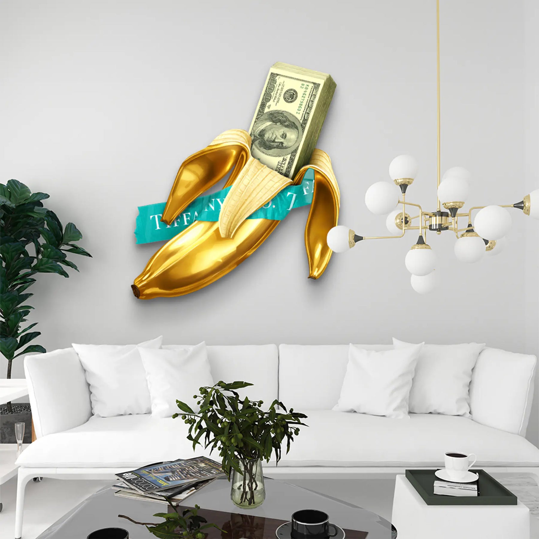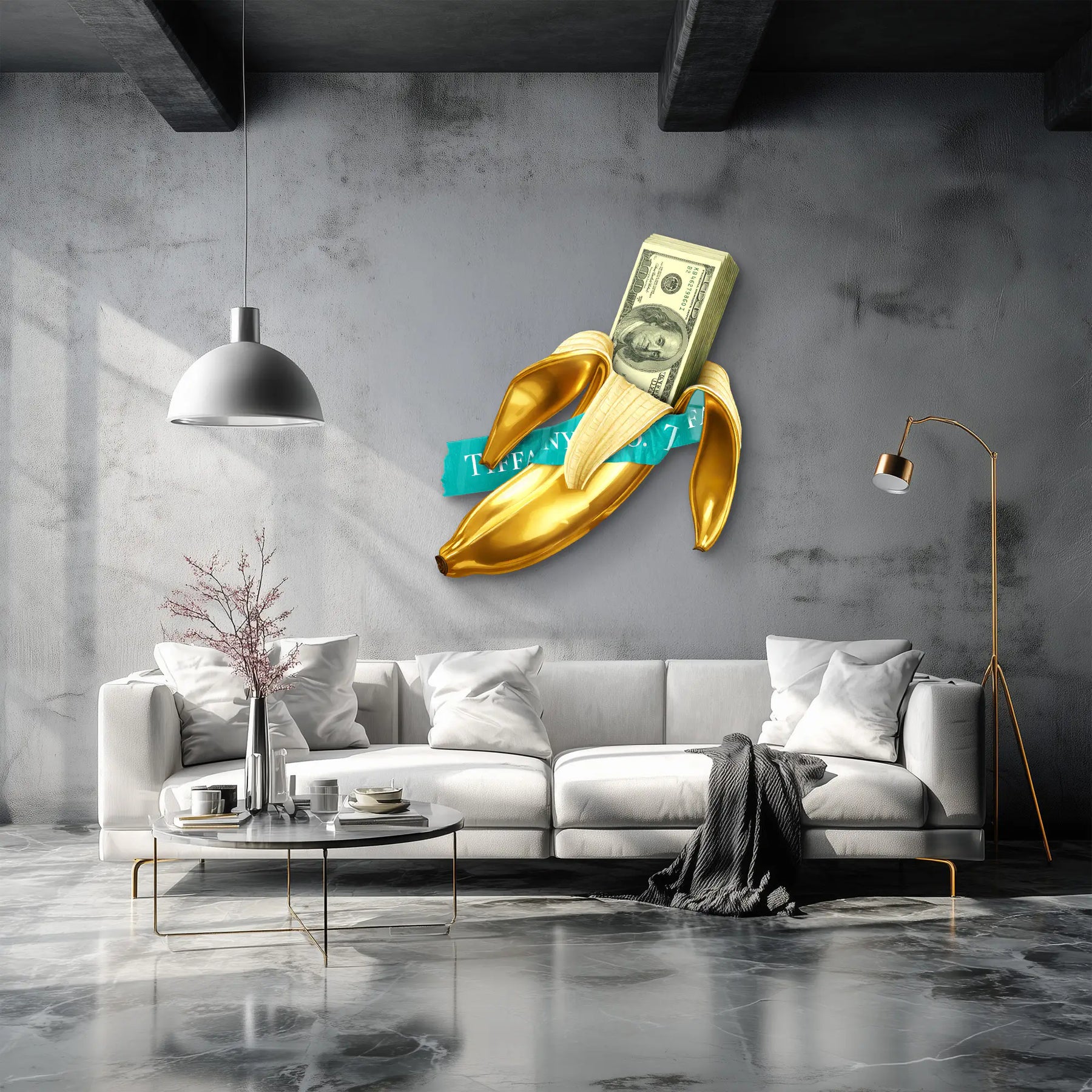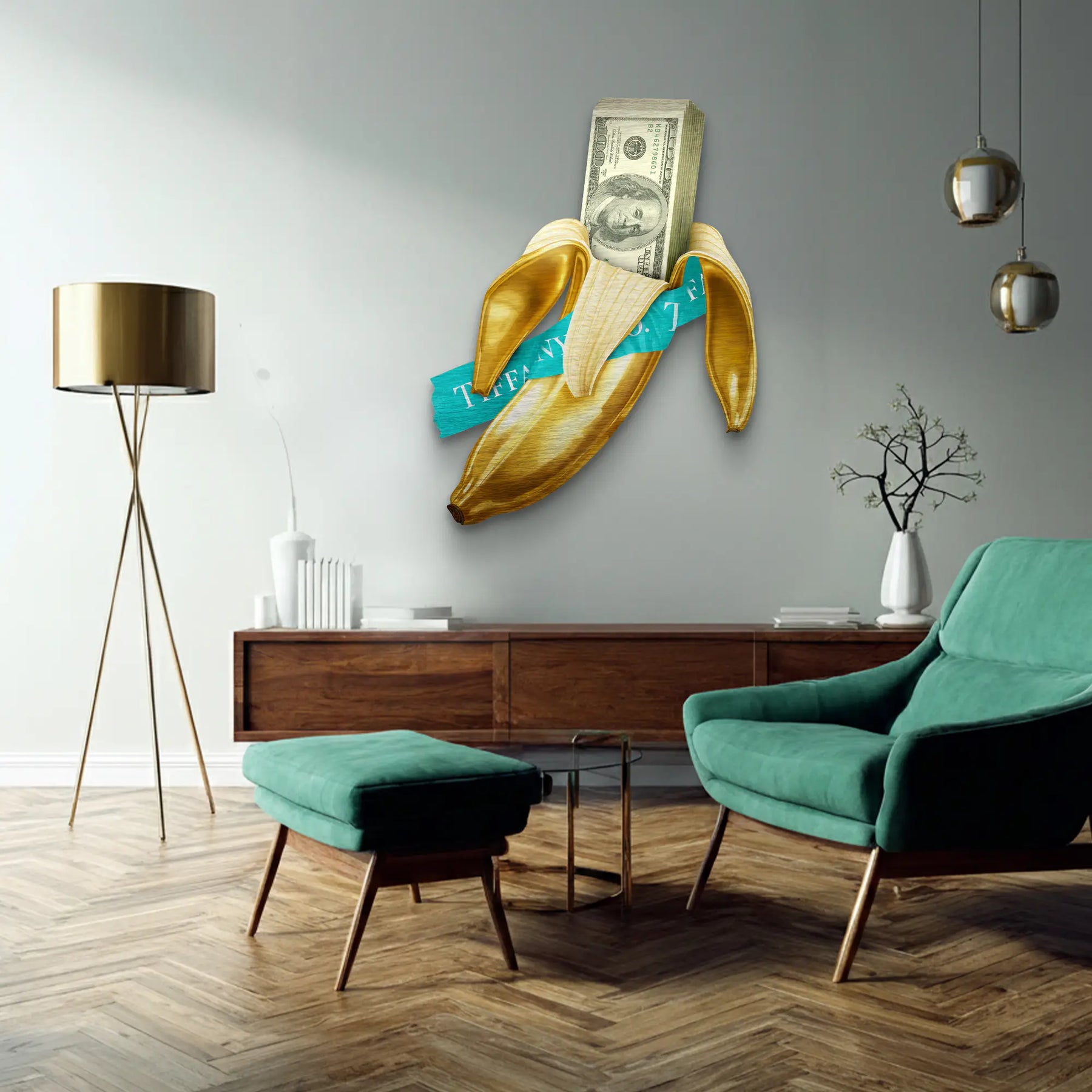 Petrol, Gold und der Duft von Geldscheinen. Eine goldene Banane, halb aufgebrochen, gibt ein dickes Bündel Hundertdollarnoten frei. Was sie zusammenhält: ein Streifen petrolfarbenes Klebeband mit dem Schriftzug von Tiffany and Co. Ein Bild, das zwei ikonische Symbole des Reichtums zu etwas völlig Eigenem zusammenfügt.