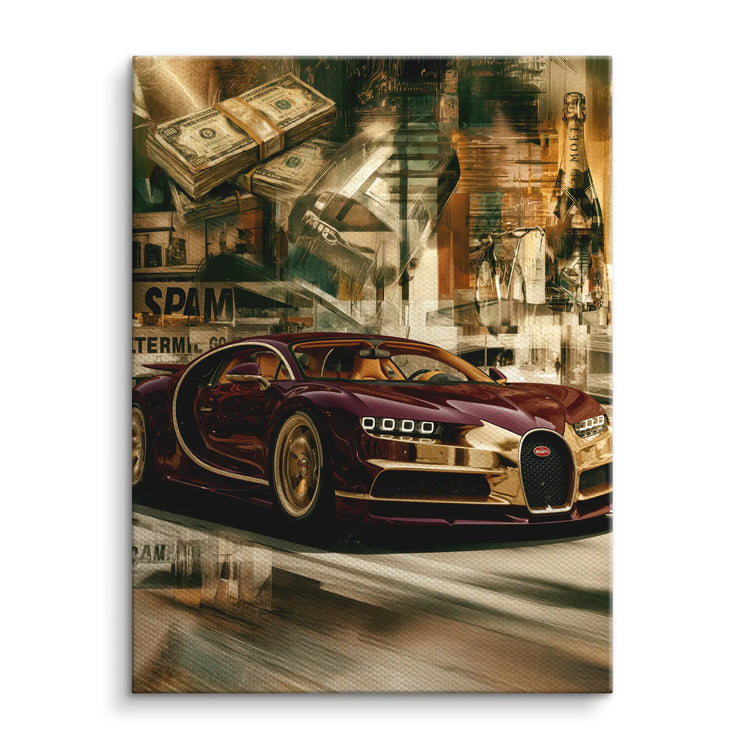 „Pure Excess“ von ArtMind ist ein intensives Fine Art Wandbild, das kompromisslosen Luxus, Geschwindigkeit und Überfluss in einer kraftvollen visuellen Collage inszeniert. Ein extremer Supersportwagen dominiert die Szene und verschmilzt mit Elementen aus Geld, Architektur und urbaner Dynamik zu einem Bild voller Energie und Provokation. Warme Goldtöne, tiefe Kontraste und eine bewusst vielschichtige Komposition erzeugen ein Gefühl von Macht, Erfolg und grenzenloser Ambition. Dieses Kunstwerk wirkt selbstbewusst, modern und luxuriös und ist ideal für Räume, die Stärke, Status und einen markanten Stil ausstrahlen sollen.