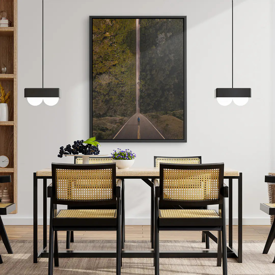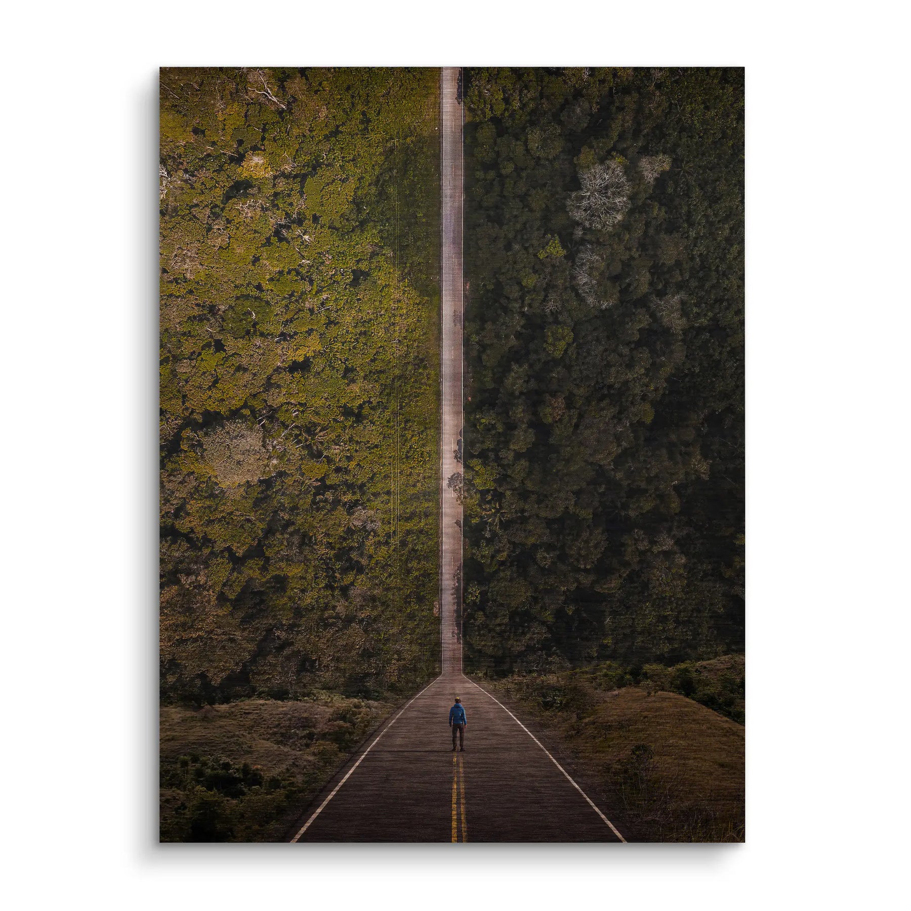 Straight ahead von Egzon Muliqi ist ein kraftvolles Fine Art Wandbild, das Klarheit, Entschlossenheit und den Mut zur eigenen Richtung visuell auf den Punkt bringt. Aus der Vogelperspektive teilt eine perfekt gerade Straße zwei kontrastreiche Waldlandschaften und führt den Blick unaufhaltsam nach vorne. Am unteren Bildrand steht eine einzelne Person auf der Mittellinie und verkörpert den Moment der Entscheidung. Die starke Symmetrie und die intensive Farbgebung aus sattem Grün und tiefen Schatten erzeugen eine ruhige, zugleich eindringliche Atmosphäre. Dieses Kunstwerk steht für Fokus, Zielstrebigkeit und den Willen, seinen Weg konsequent weiterzugehen. Als ArtMind Kunstwerk setzt Straight ahead ein modernes Statement in deinem Zuhause oder Büro und verbindet zeitgenössische Fine Art Ästhetik mit inspirierender Symbolik. Eine limitierte Edition für alle, die wissen, dass Erfolg entsteht, wenn man ohne Umwege nach vorne geht.