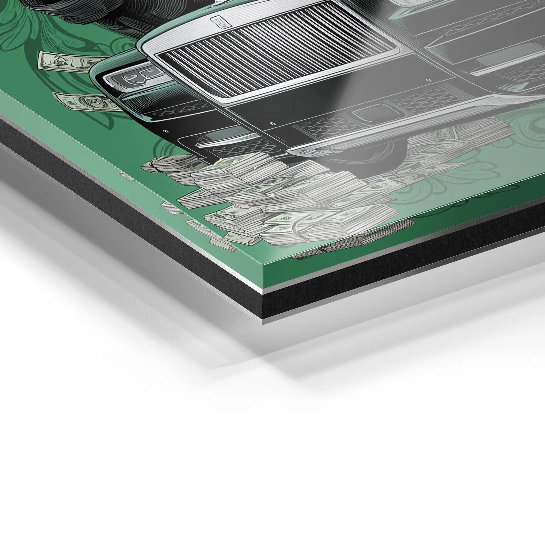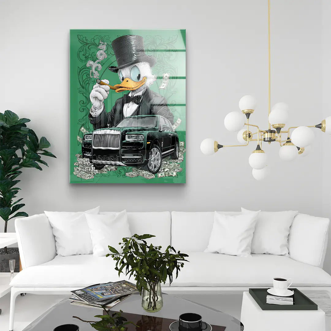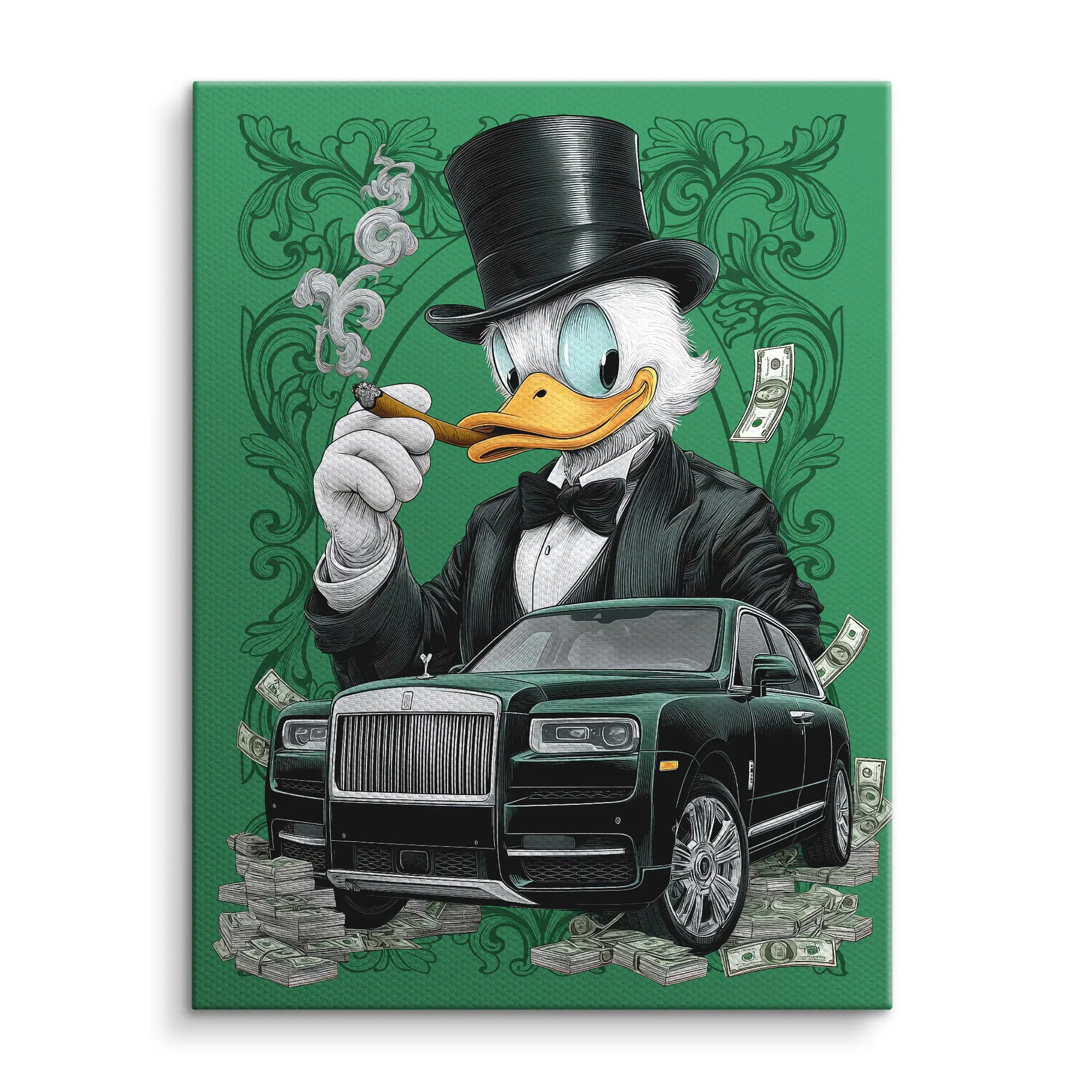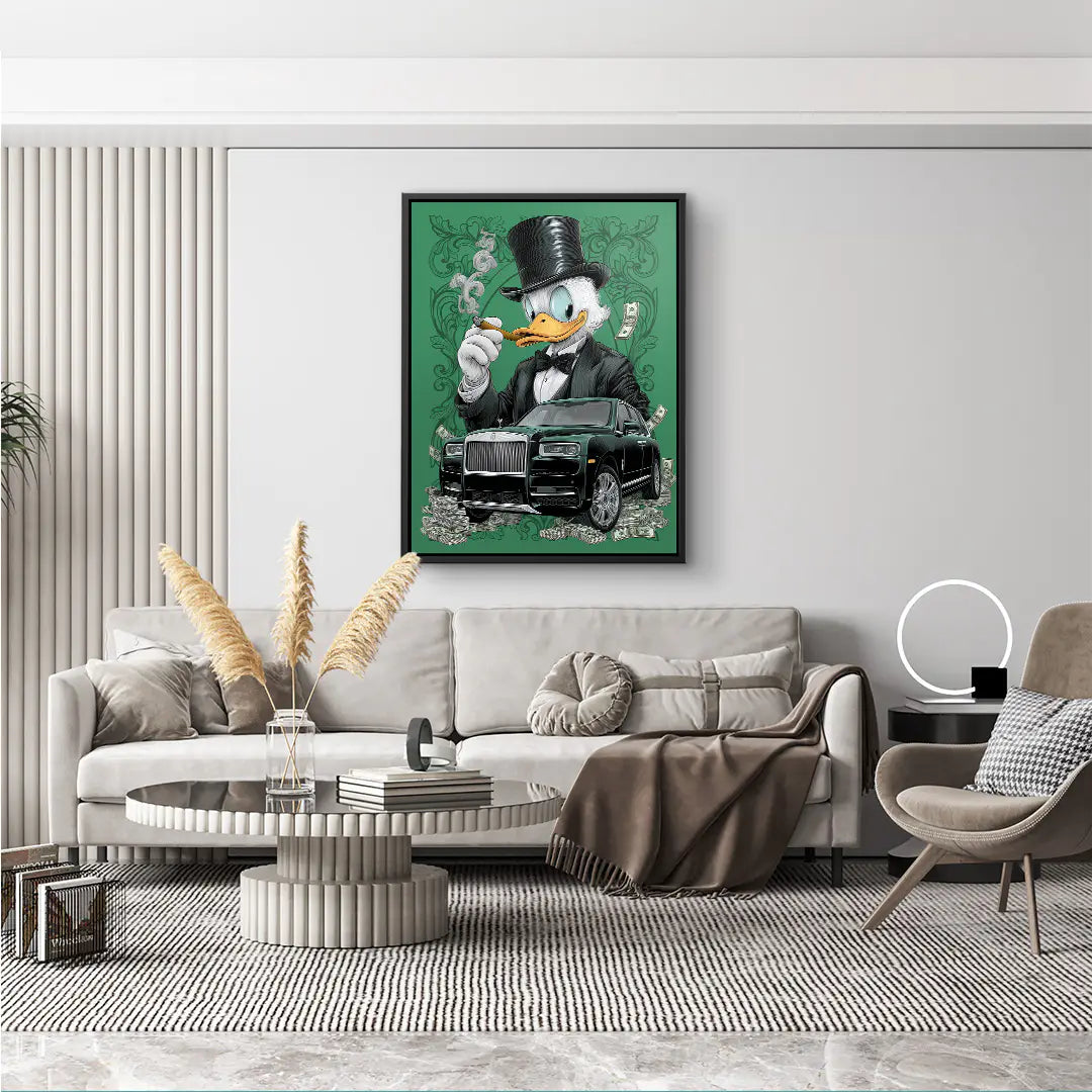 „Top Hat“ von ArtMind ist ein provokantes und zugleich stilvolles Fine Art Wandbild, das Luxus, Macht und Humor in einer ikonischen Bildsprache vereint. Die elegant gekleidete Figur mit Zylinder und Zigarre verkörpert Selbstsicherheit, Erfolg und ein bewusstes Spiel mit Statussymbolen. Umgeben von sattem Grün, fliegenden Geldscheinen und einem luxuriösen Fahrzeug entsteht eine Komposition, die Reichtum, Kontrolle und moderne Pop Art Ästhetik eindrucksvoll verbindet. Dieses Kunstwerk setzt ein klares Statement und verleiht jedem Raum eine starke Präsenz voller Charakter, Ambition und urbanem Stil.