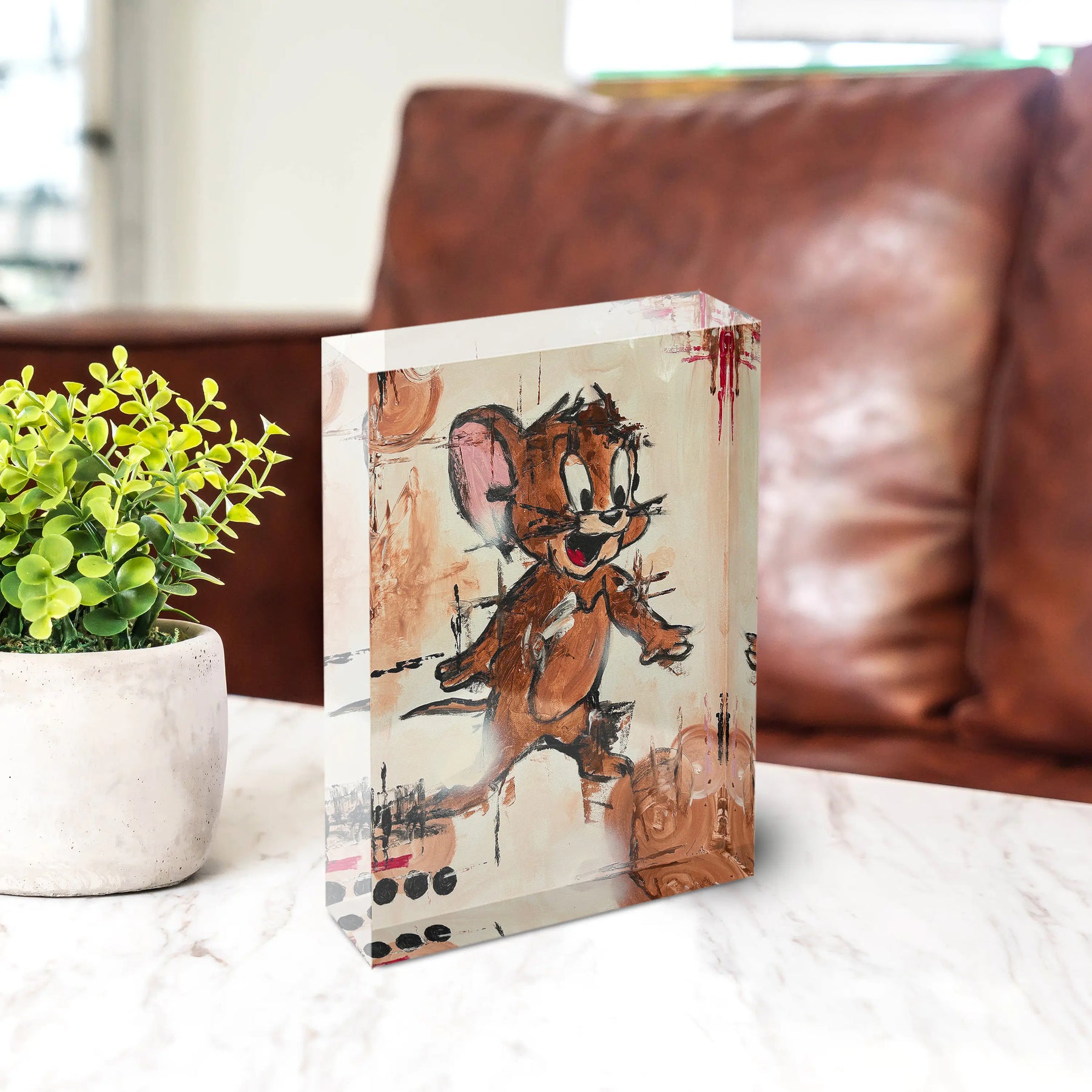 Verspieltheit, Wärme und malerische Leichtigkeit. Der Jerry Acrylblock zeigt die kleine Maus von Tom & Jerry in expressiver Malweise, mit breitem Grinsen und ausgebreiteten Armen in Bewegung. Grobe Pinselstriche in Braun, Beige und Rosa auf hellem Grund geben dem Motiv den Charakter eines echten Gemäldes, ergänzt von roten Farbläufern und abstrakten Akzenten im Hintergrund.