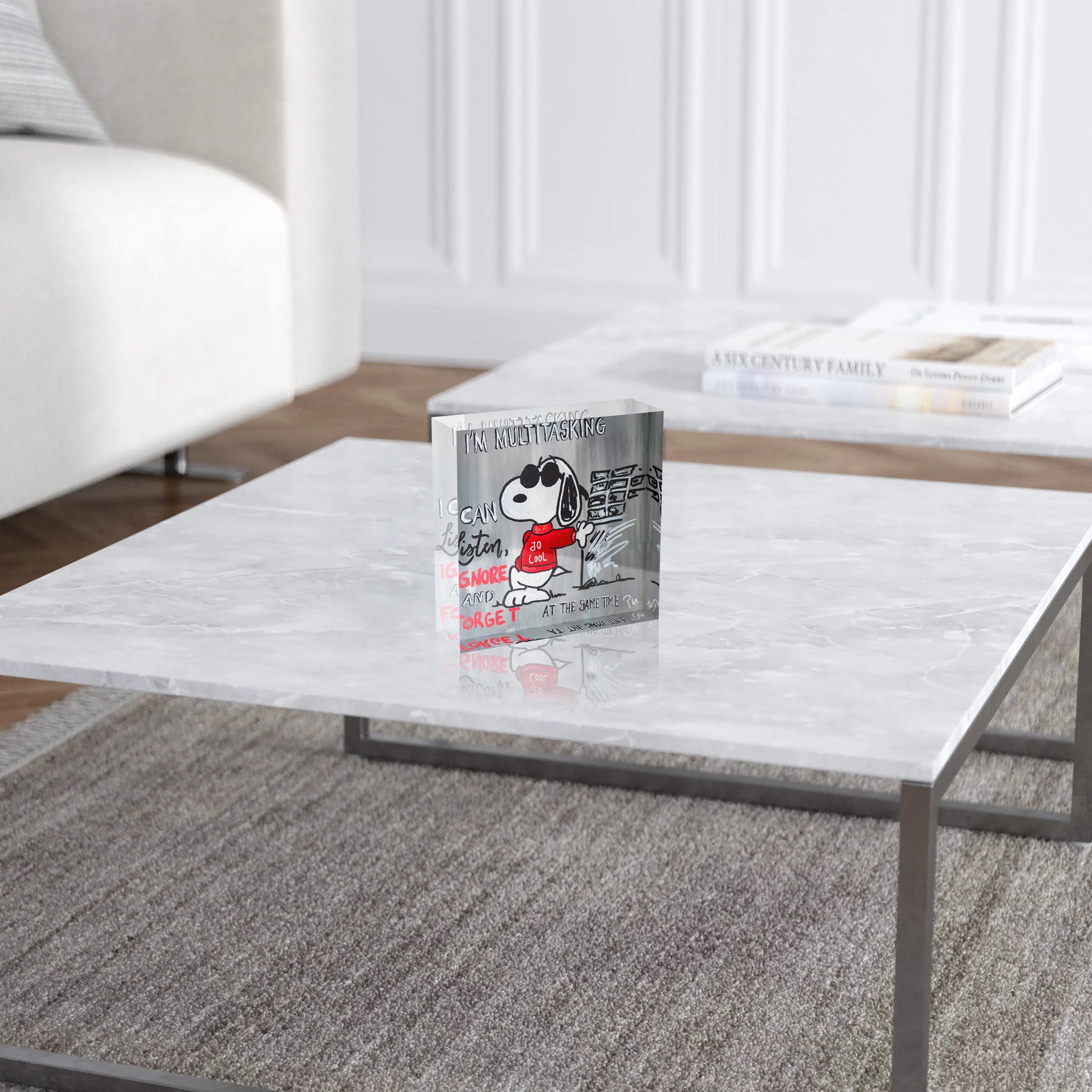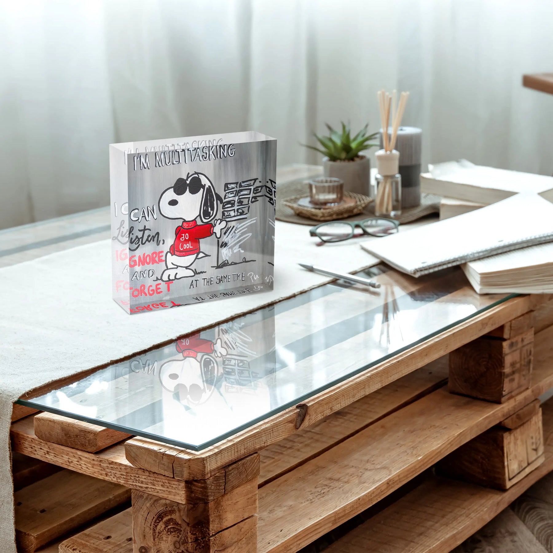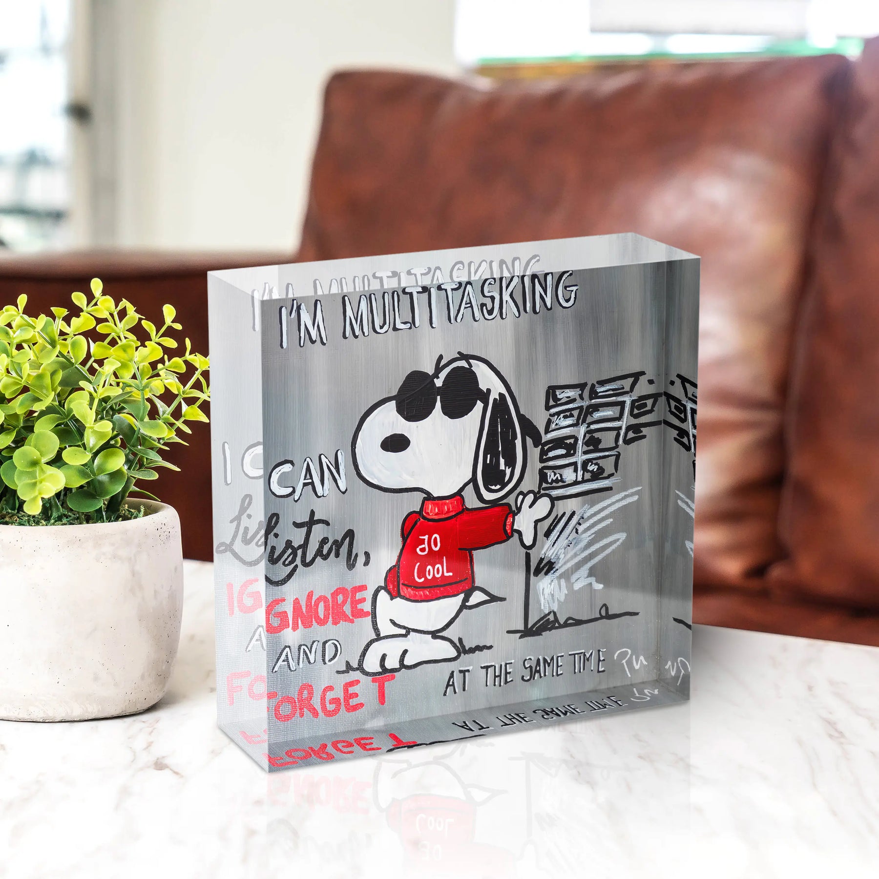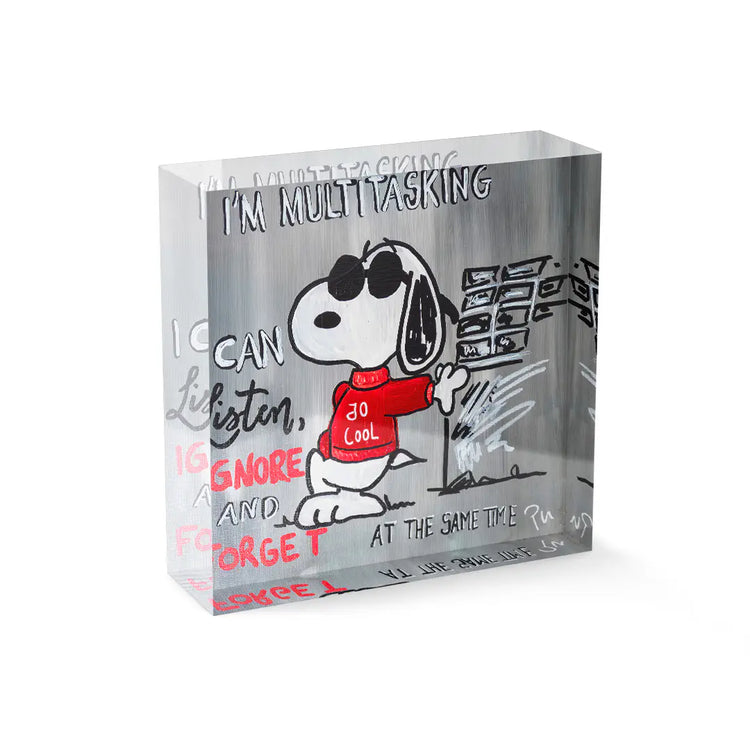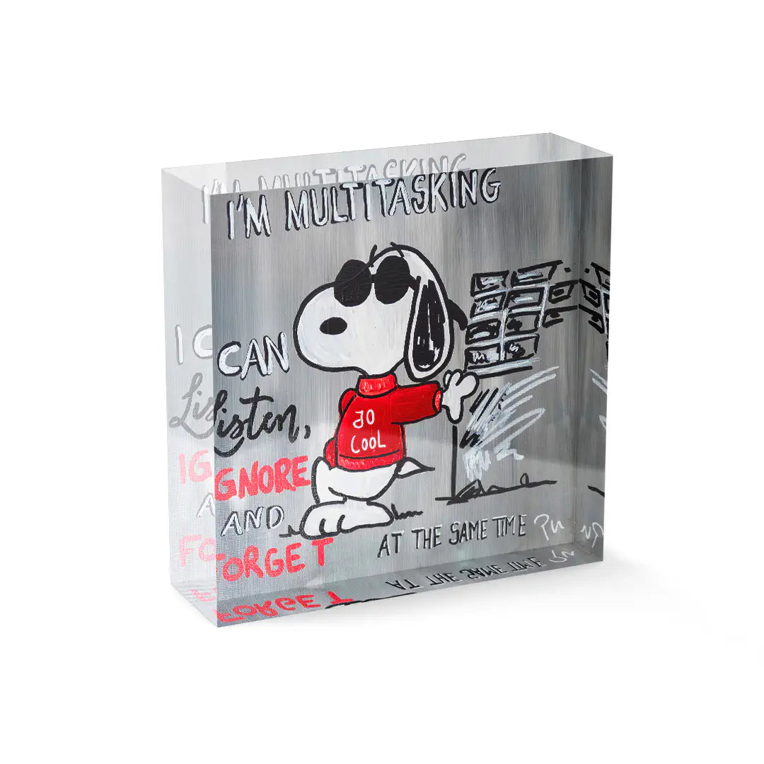 Lässigkeit, Witz und Pop Art Energie. Der Jo Cool Acrylblock zeigt Snoopy als coolen Joe Cool mit rotem Pullover und Sonnenbrille, umgeben von handgeschriebenen Schriftzügen in Schwarz, Weiß und Pink. Der Text „I'm Multitasking – I can listen, ignore and forget at the same time" macht das Motiv zum augenzwinkernden Statement für jeden Schreibtisch.