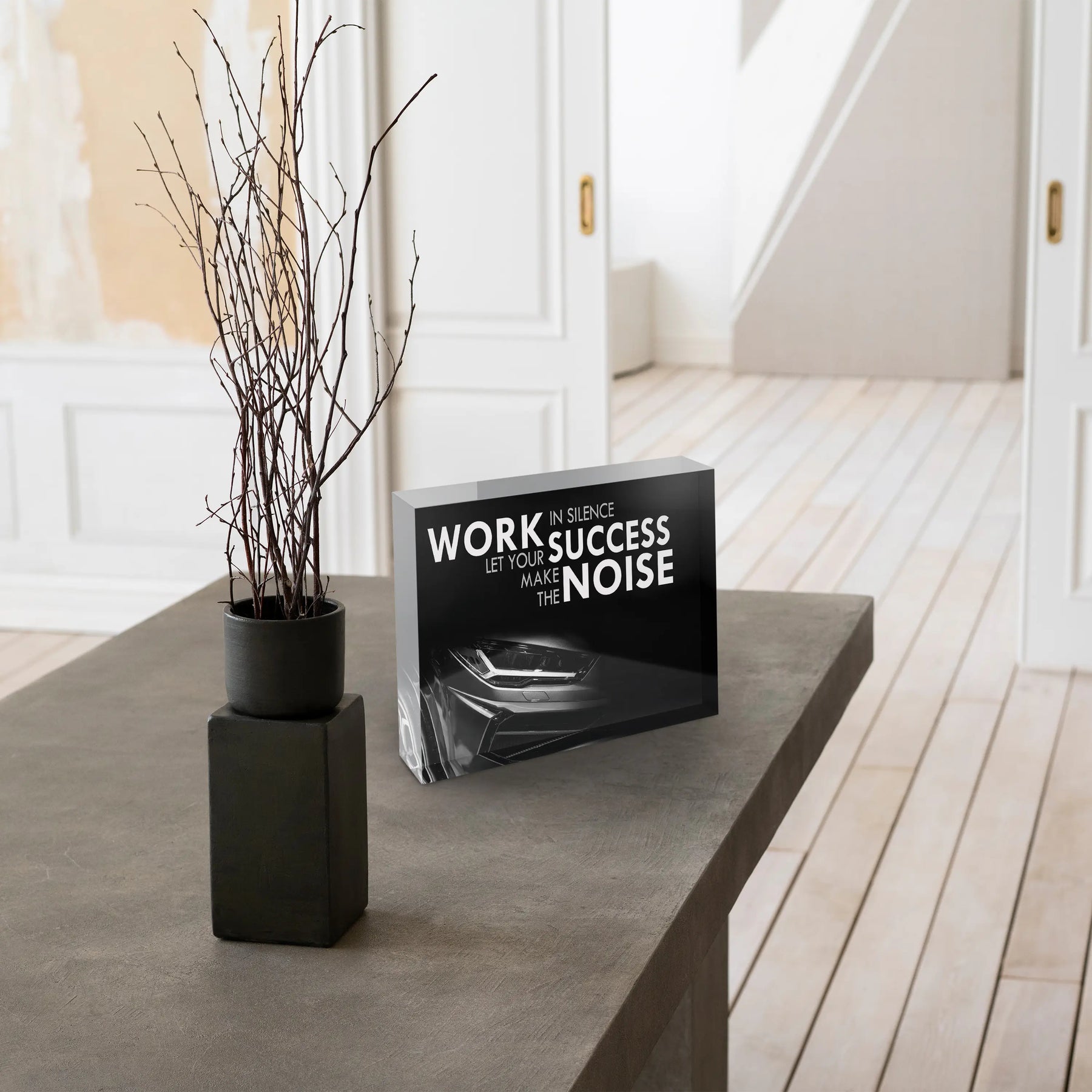 Ambition, Disziplin und der Moment, in dem Ergebnisse für sich sprechen. Der Acrylblock zeigt den Schriftzug "WORK IN SILENCE. LET YOUR SUCCESS MAKE THE NOISE" in starker Typografie auf dunklem Hintergrund, darunter die angeschnittene Front eines schwarzen Sportwagens mit leuchtendem Scheinwerfer. Das Motiv verbindet den Antrieb, still an großen Zielen zu arbeiten, mit dem Bild von Erfolg, der sich selbst zeigt.