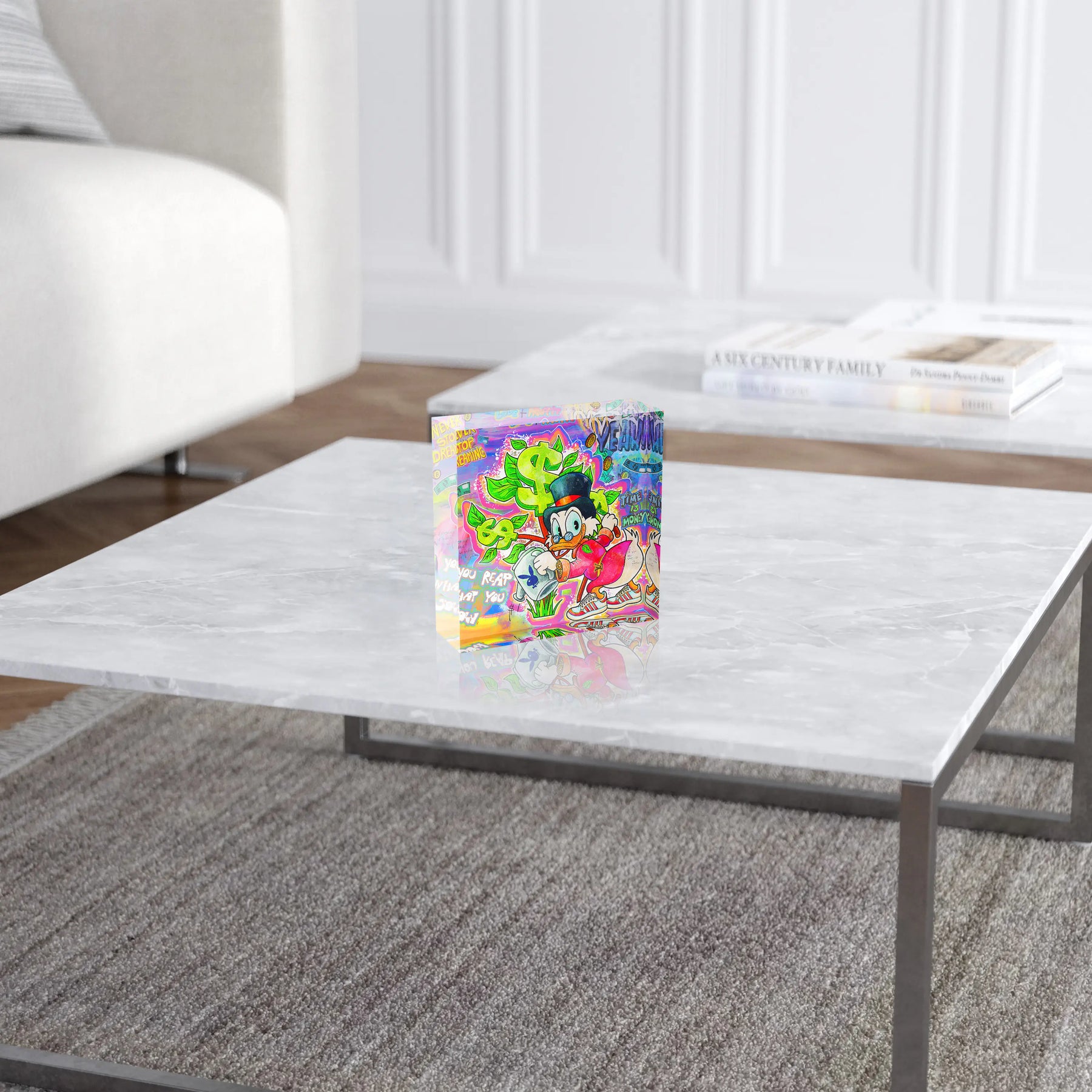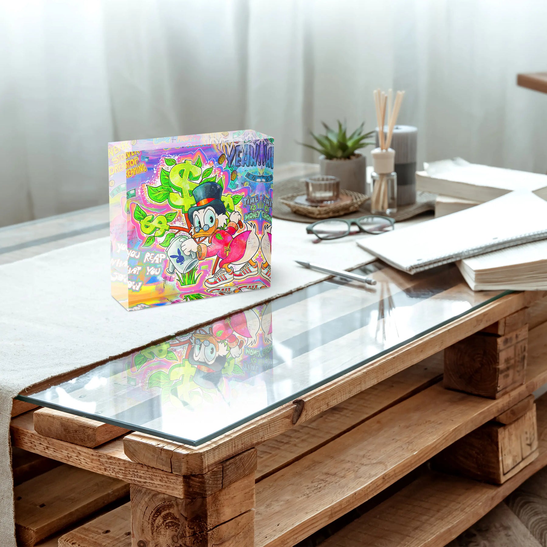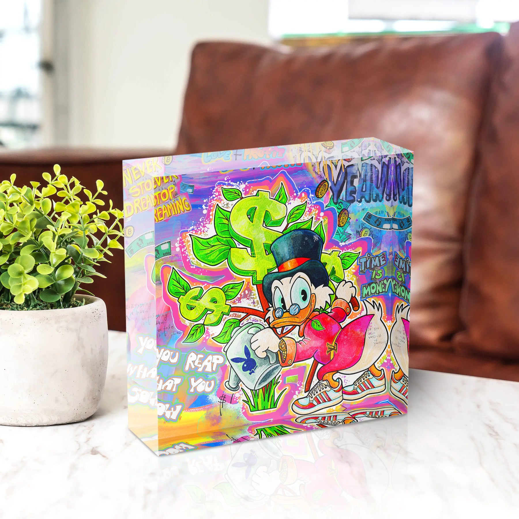 Reichtum, Antrieb und grelle Pop Art Kraft. Der Money Tree Dreams Acrylblock zeigt Dagobert Duck mit Zylinder und Kneifer, der einen prallen Geldsack umklammert und Sneaker an den Füßen trägt. Über ihm wächst ein leuchtendes Dollarzeichen wie ein Baum aus grünen Blättern, eingebettet in ein buntes Graffiti Chaos aus Schriftzügen wie „Never Stop Dreaming", „Time is Money" und „You Reap What You Sow".