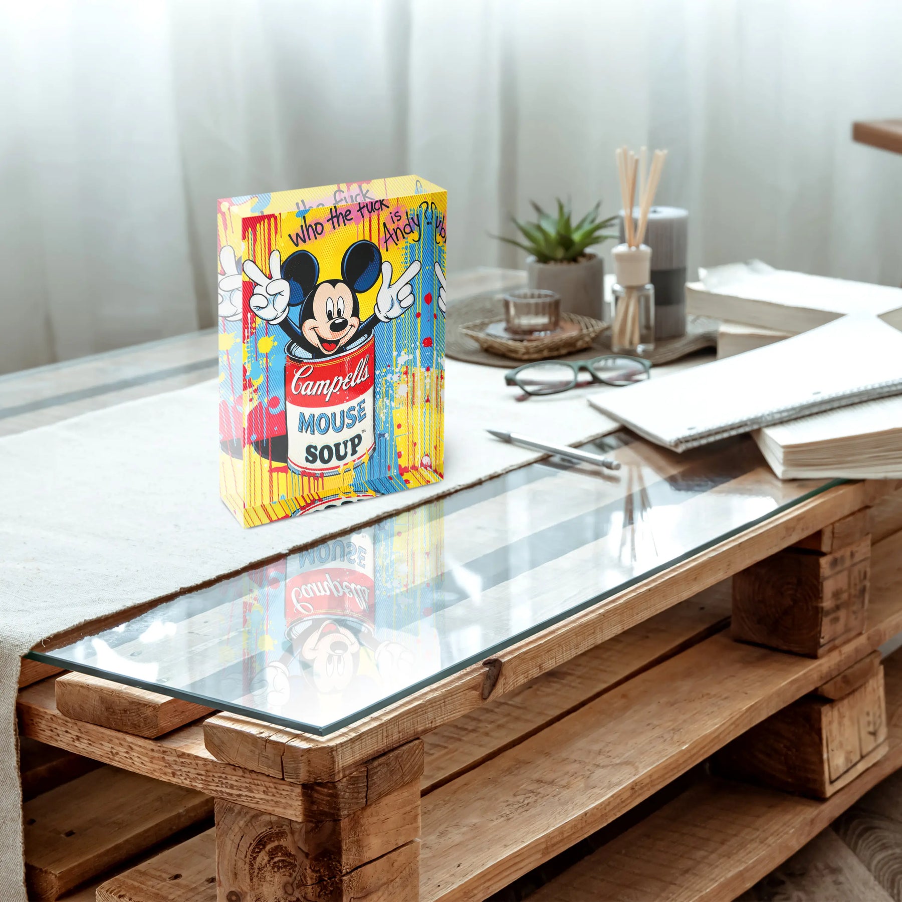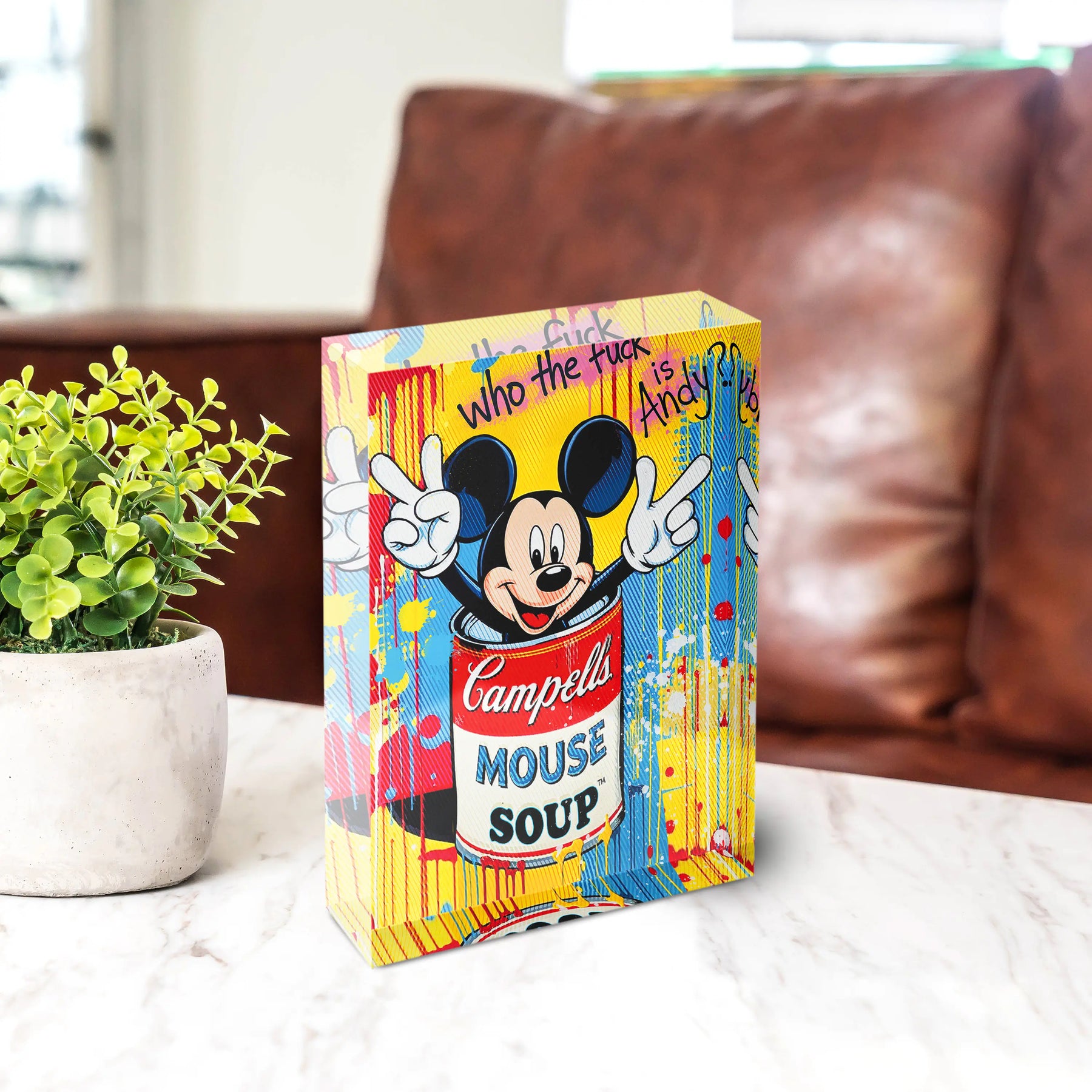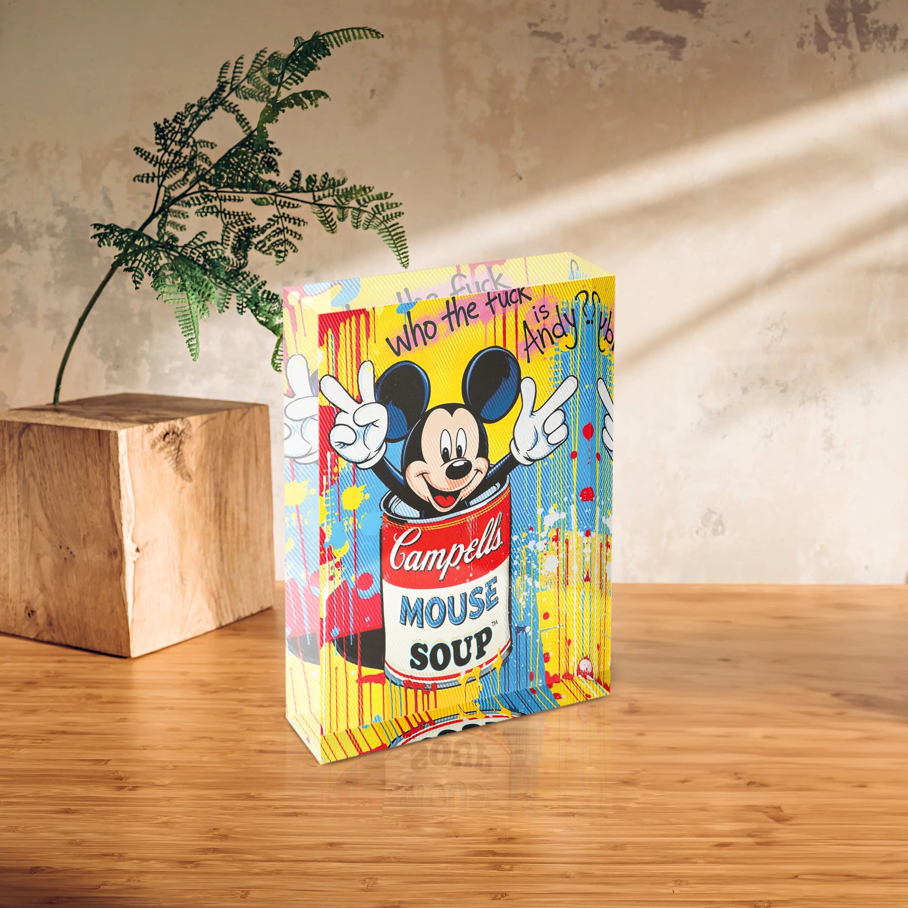 Farbe, Freude und ein Augenzwinkern an die Kunstgeschichte. Der Mouse Soup Acrylblock zeigt eine Campells Suppendose in Rot und Weiß, aus der Micky Maus mit ausgebreiteten Armen springt. Die Aufschrift „Mouse Soup" ersetzt das Original, während der handgeschriebene Schriftzug „Who the fuck is Andy?" über der Szene schwebt. Der Hintergrund explodiert in Gelb, Blau und Rot mit laufenden Farbstreifen und Farbspritzern.