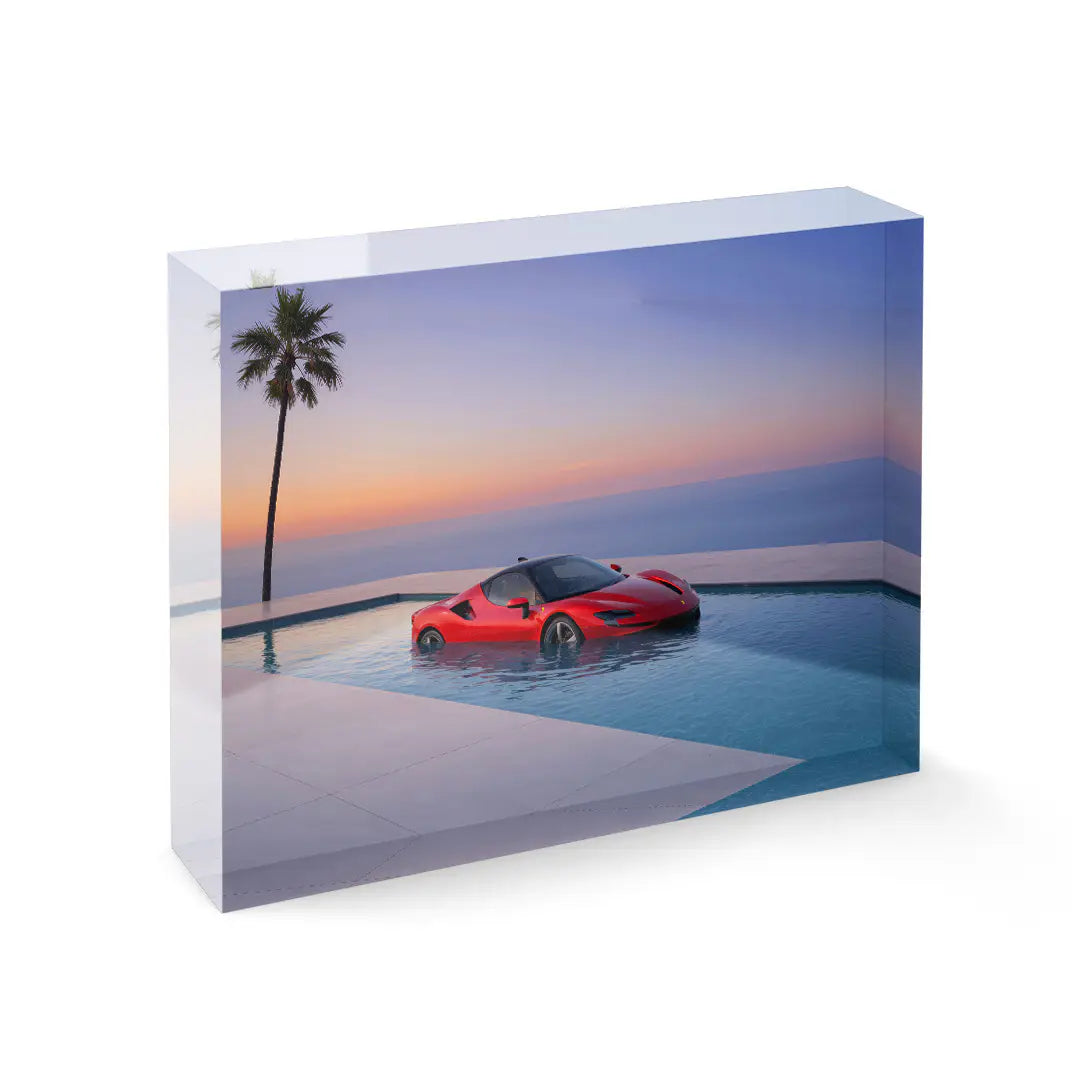 Stille, Überfluss und ein roter Sportwagen im Infinity Pool. Der Red Dream Acrylblock zeigt einen leuchtend roten Ferrari Supersportwagen, der halb im Wasser eines weißen Infinitypools versinkt, während im Hintergrund eine schlanke Palme vor einem pastellfarbenen Abendhimmel steht. Das Bild ist ruhig bis zur Absurdität, die Kombination aus Luxus und Gleichgültigkeit gegenüber dem Wert der Dinge erzeugt eine traumartige Stimmung irgendwo zwischen Wunsch und Ironie.