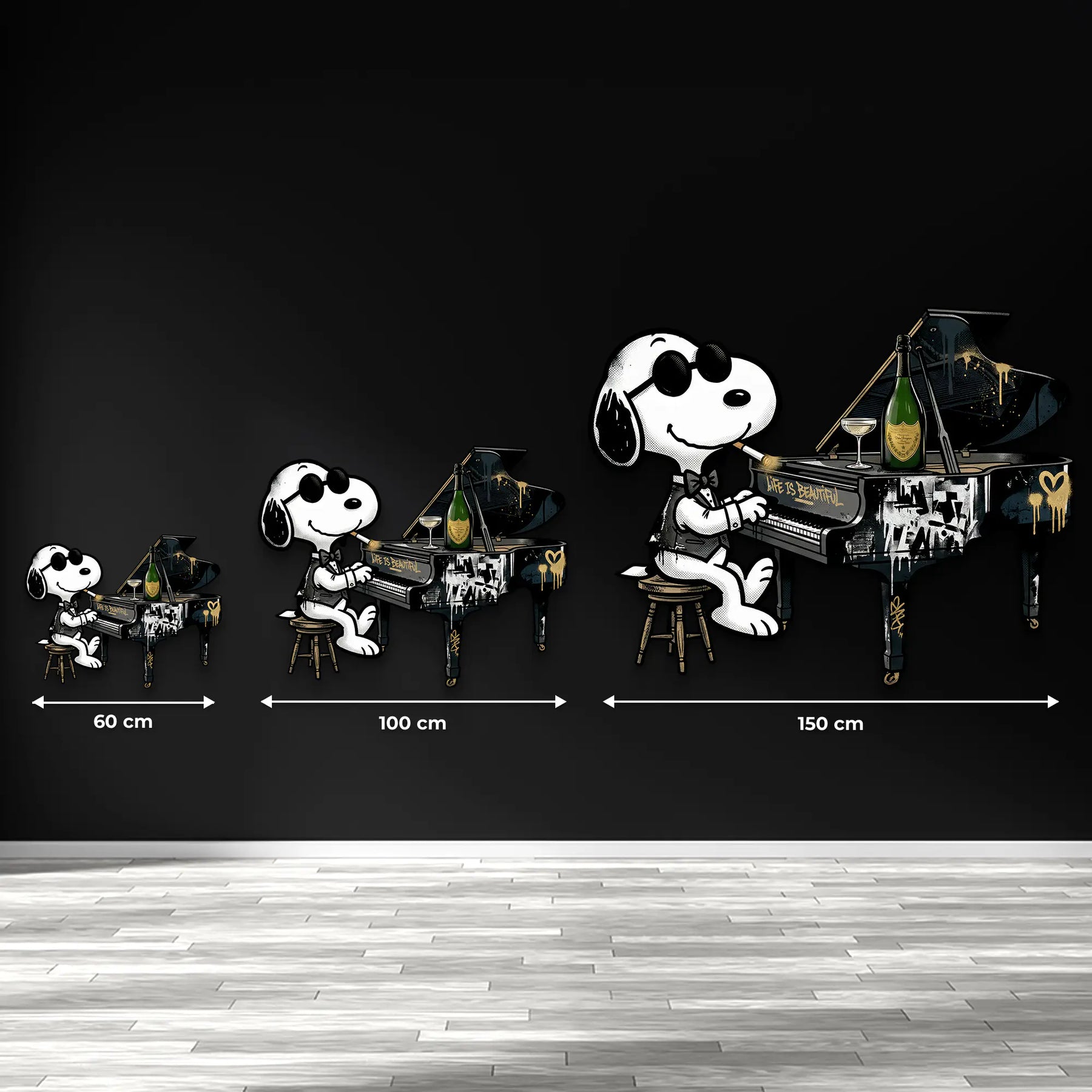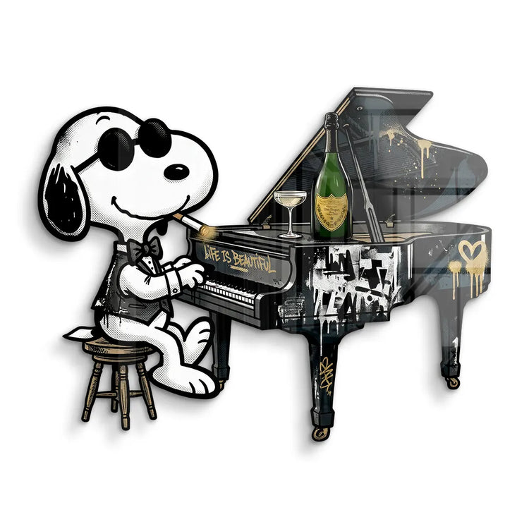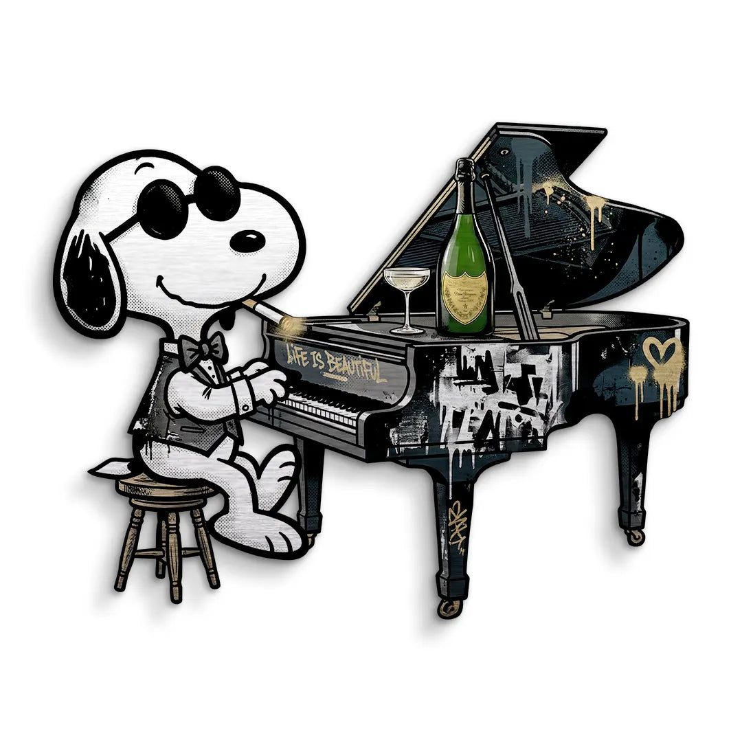 Stil, Leichtigkeit und der Klang eines besonderen Abends. Champagne Notes zeigt Snoopy im Smoking mit Sonnenbrille, der an einem schwarz lackierten Flügel spielt. Eine Flasche Dom Pérignon und ein Champagnerglas stehen auf dem Instrument, dessen Seite mit Graffiti und dem Schriftzug "Life is Beautiful" bedeckt ist. Der schwarze Hintergrund lässt die goldenen Akzente und weißen Halftone-Elemente klar leuchten.