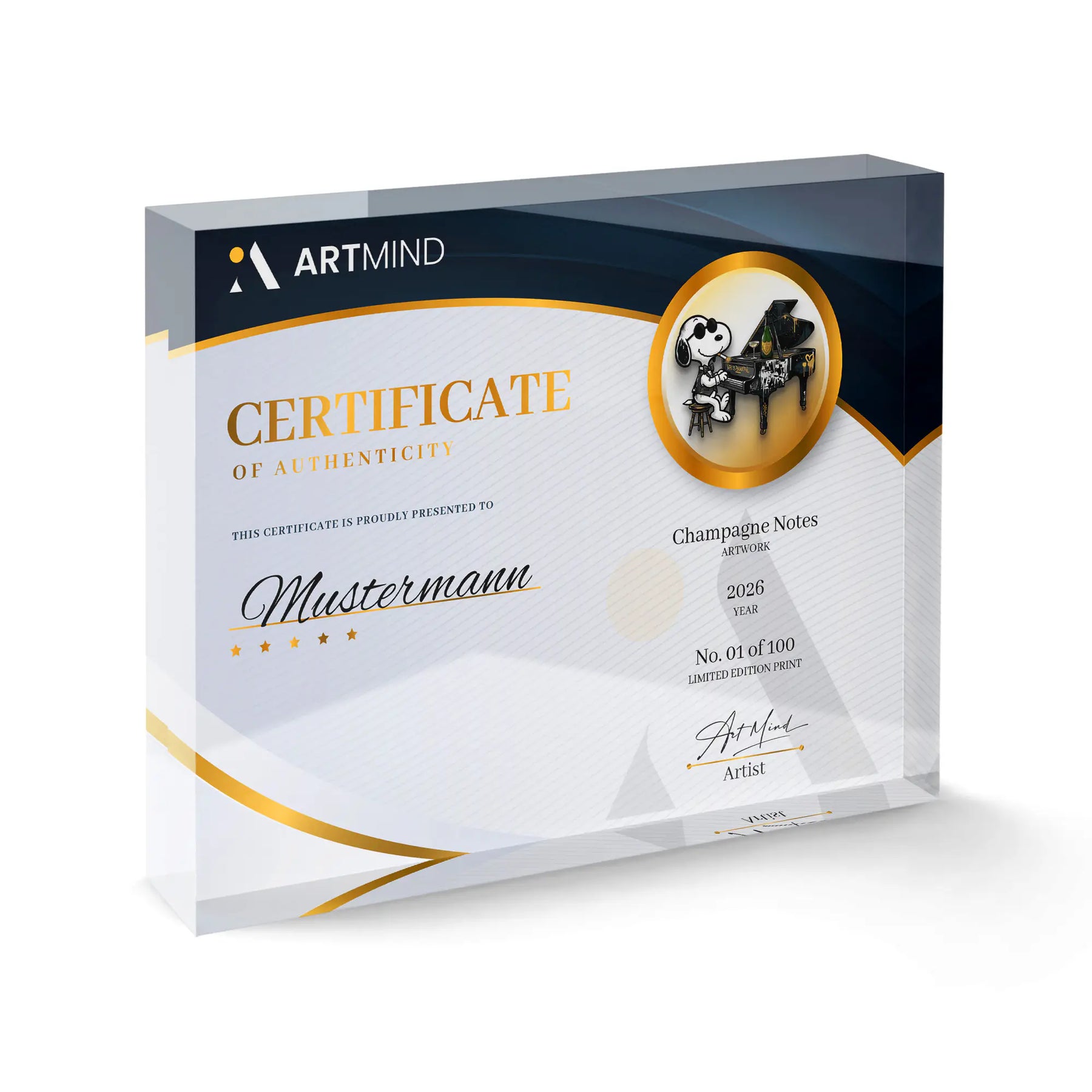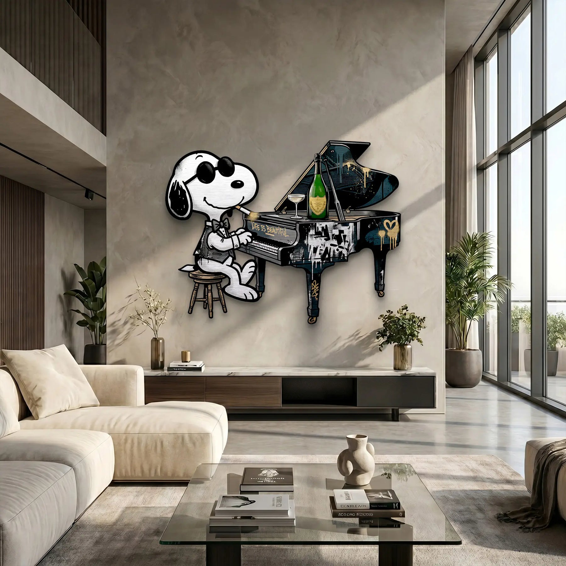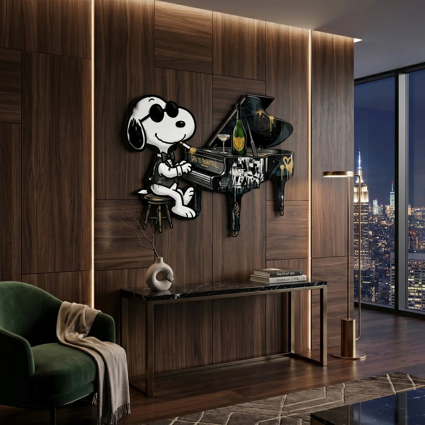 Stil, Leichtigkeit und der Klang eines besonderen Abends. Champagne Notes zeigt Snoopy im Smoking mit Sonnenbrille, der an einem schwarz lackierten Flügel spielt. Eine Flasche Dom Pérignon und ein Champagnerglas stehen auf dem Instrument, dessen Seite mit Graffiti und dem Schriftzug "Life is Beautiful" bedeckt ist. Der schwarze Hintergrund lässt die goldenen Akzente und weißen Halftone-Elemente klar leuchten.