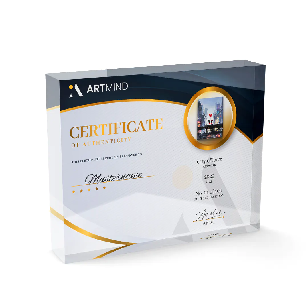 Unser hochwertiges Zertifikat im edlen Acrylblock bestätigt die Originalität und Wertigkeit deines Kunstwerks. Es enthält die Editionsnummer, den Namen des Eigentümers, die Original-Signatur und die Print-ID.