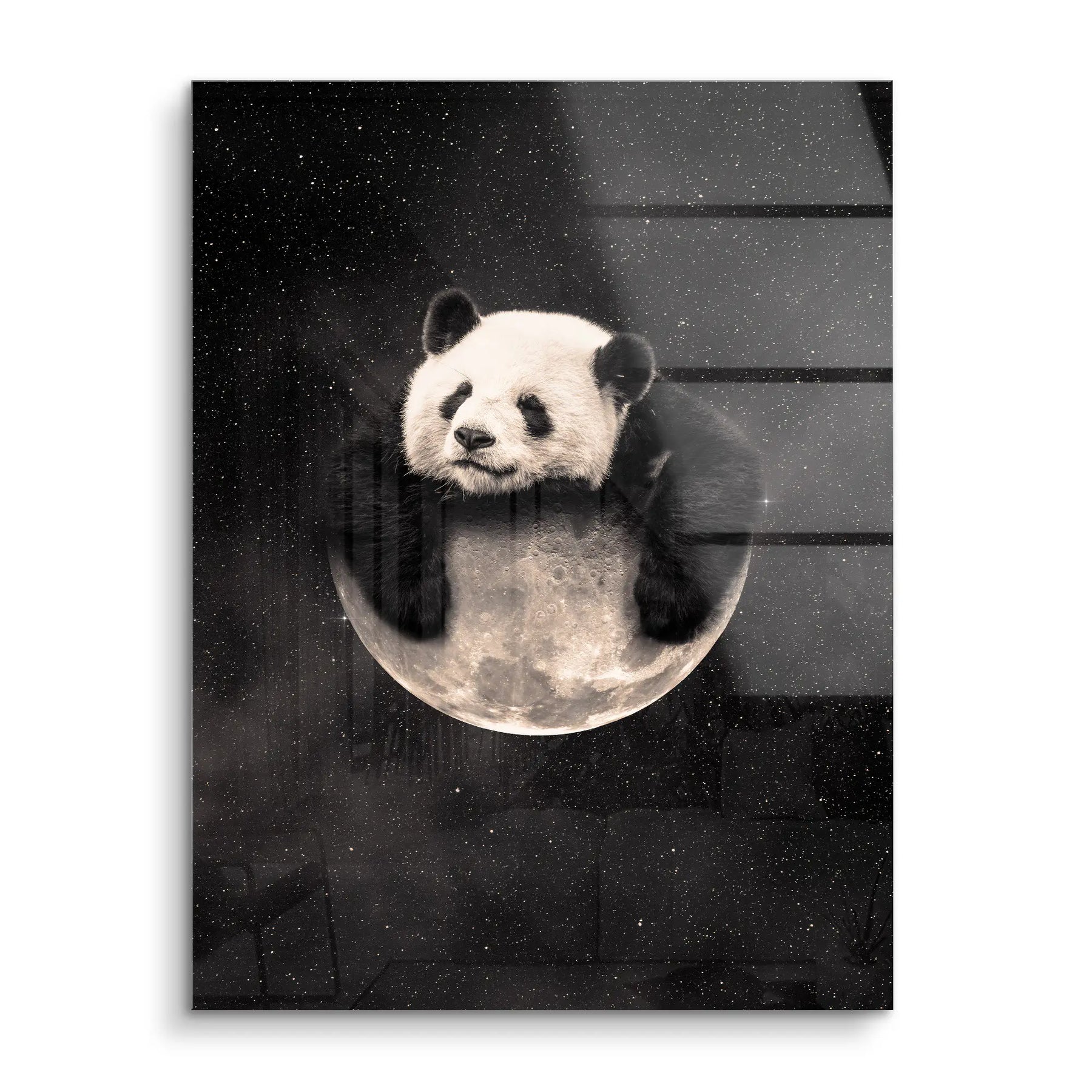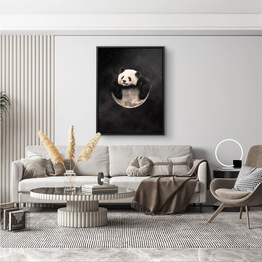Cosmic Cuddle von Egzon Muliqi verbindet verspielte Wärme mit grenzenloser Weite. Ein Panda ruht entspannt auf einer leuchtenden Mondsichel, eingebettet in einen funkelnden Sternenhimmel. Das Werk erschafft einen poetischen Kontrast zwischen kindlicher Geborgenheit und der unendlichen Tiefe des Universums. Die sanften Schwarz-Weiß-Töne des Pandas harmonieren mit dem silbrigen Mondlicht und der dunklen Galaxie – eine ruhige, verträumte Komposition mit starker emotionaler Wirkung.