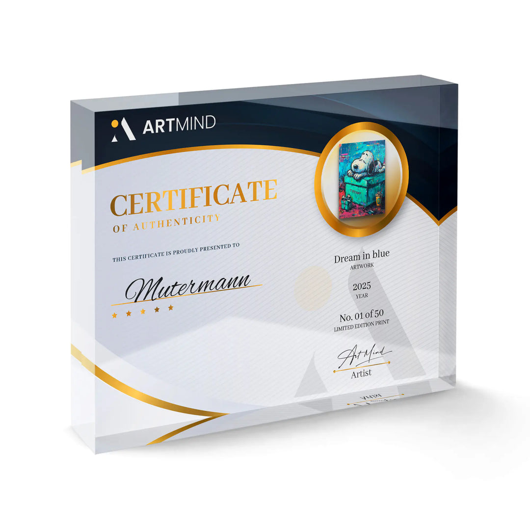 Unser hochwertiges Zertifikat im edlen Acrylblock bestätigt die Originalität und Wertigkeit deines Kunstwerks. Es enthält die Editionsnummer, den Namen des Eigentümers, die Original-Signatur und die Print-ID.