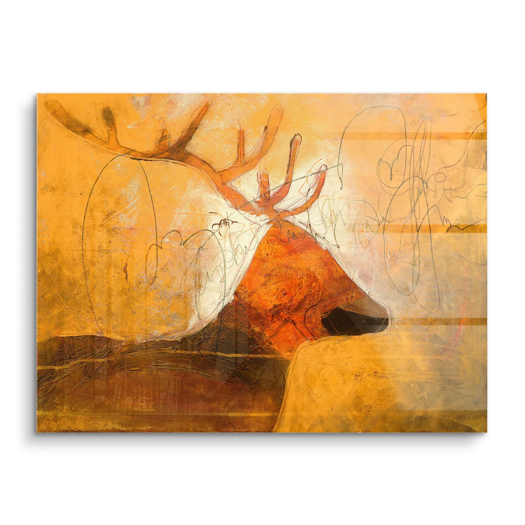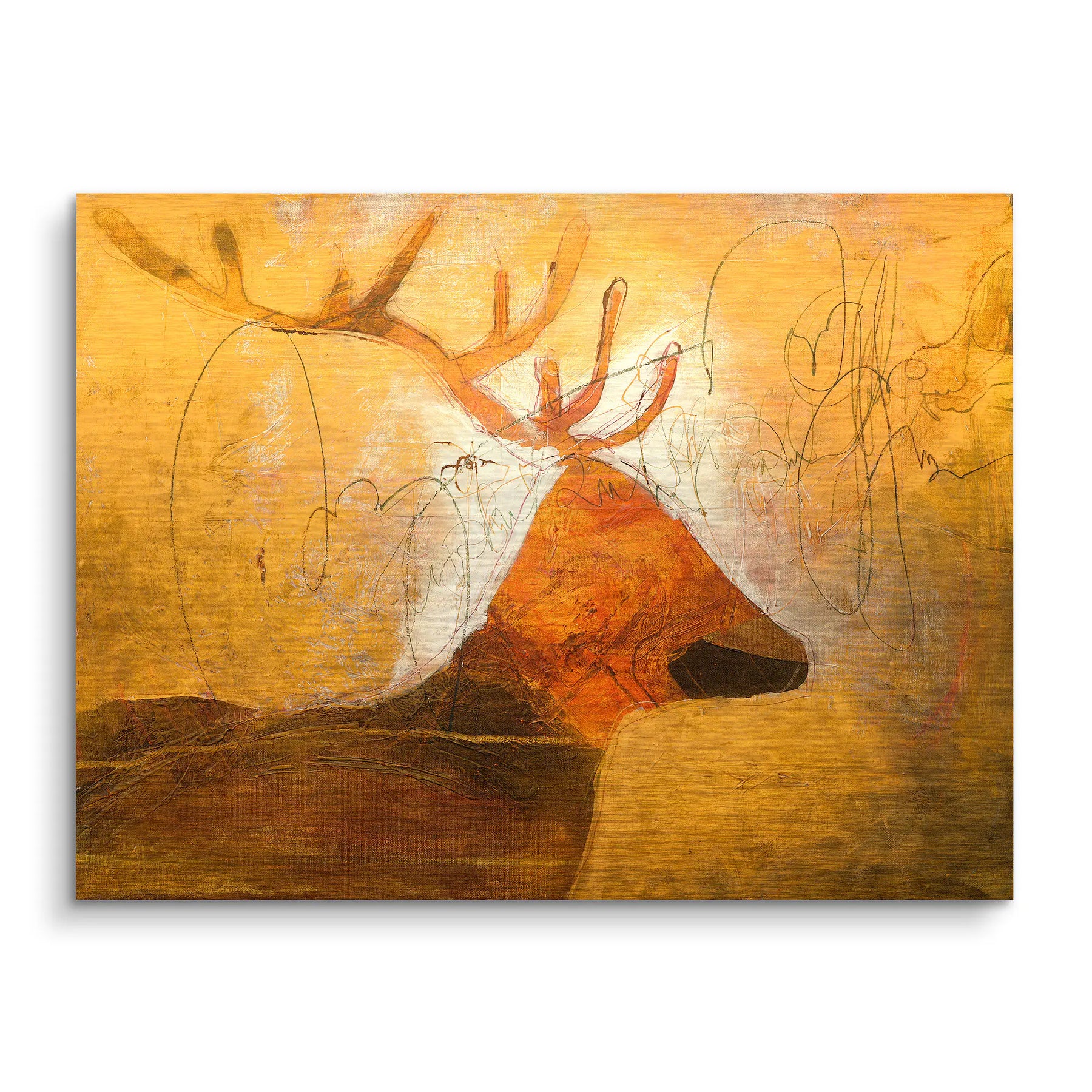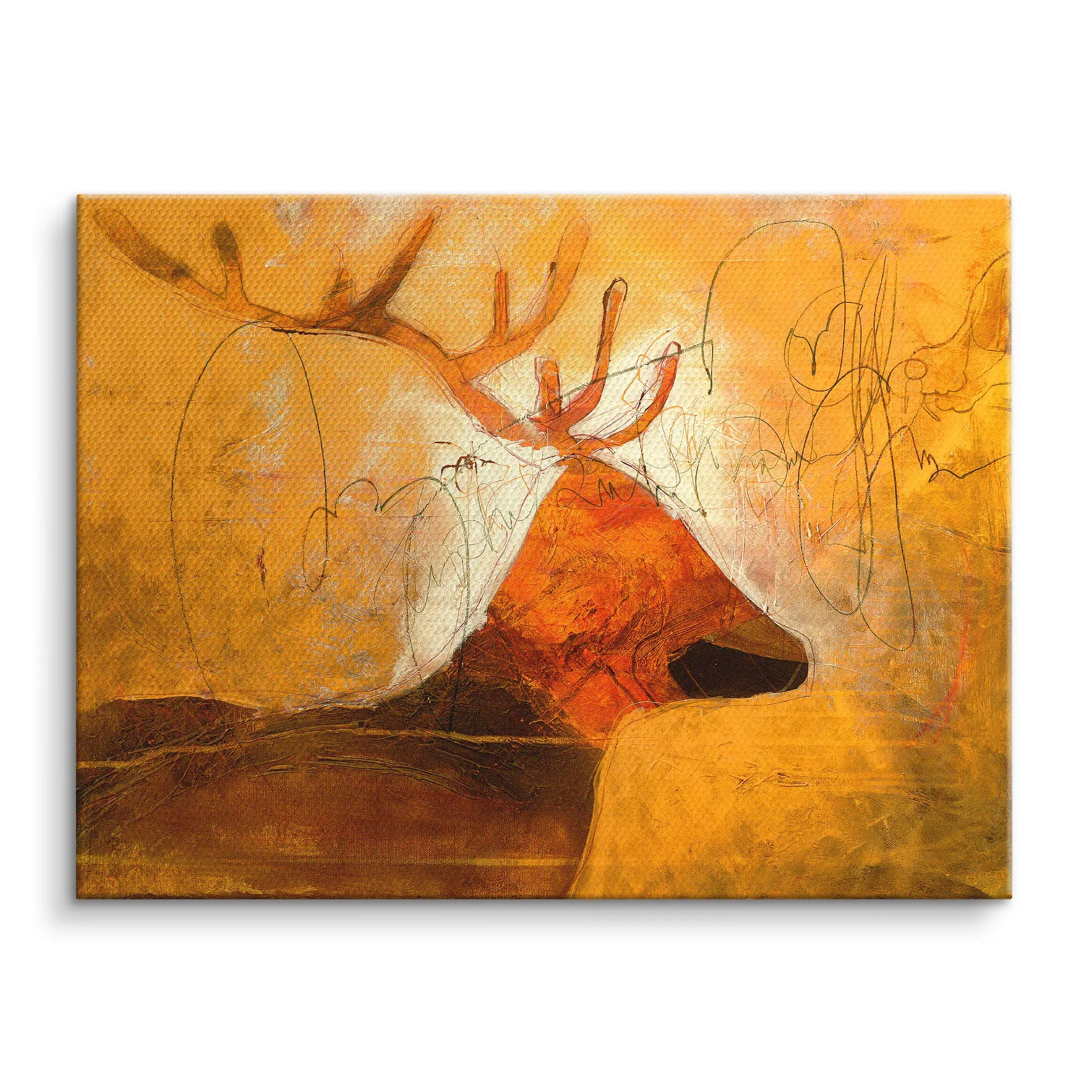 Goldenes Licht, archaische Ruhe und wilde Anmut. Earth Soul zeigt einen abstrahierten Hirsch im Profil, dessen mächtiges Geweih sich in warmen Rost und Brauntönen aus einem leuchtend goldorangenen Hintergrund erhebt. Feine Bleistiftlinien und skizzenhafte Zeichnungen überlagern die dichten Farbflächen und erzeugen eine Spannung zwischen roher Malerei und zarter Grafik. Dunkle Erdtöne im unteren Bereich verankern das Motiv, während ein heller Lichtkranz hinter dem Geweih für eine fast sakrale Ausstrahlung sorgt.
