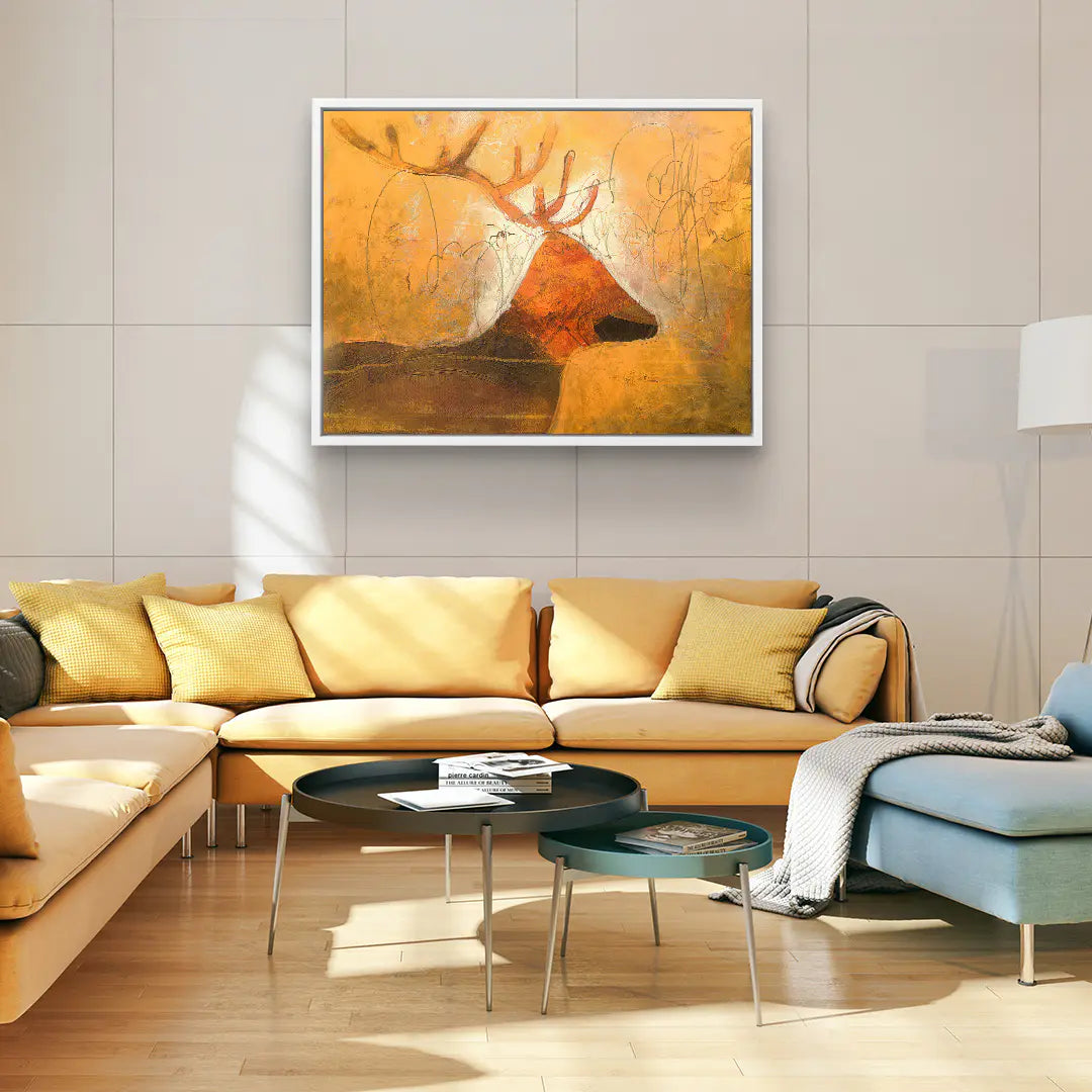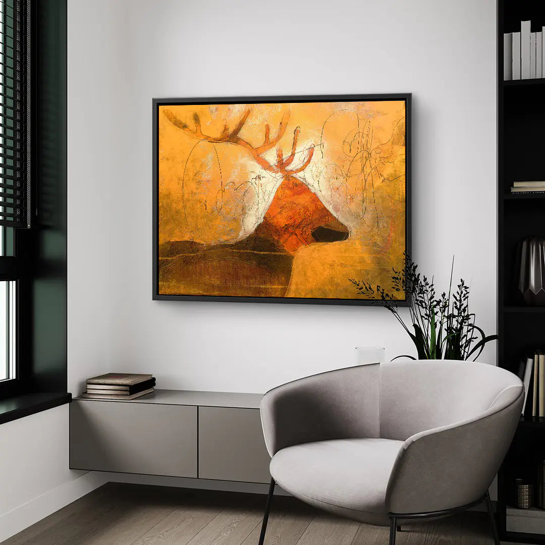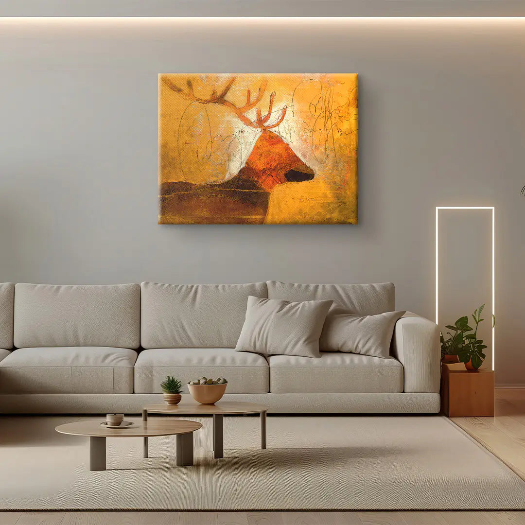 Goldenes Licht, archaische Ruhe und wilde Anmut. Earth Soul zeigt einen abstrahierten Hirsch im Profil, dessen mächtiges Geweih sich in warmen Rost und Brauntönen aus einem leuchtend goldorangenen Hintergrund erhebt. Feine Bleistiftlinien und skizzenhafte Zeichnungen überlagern die dichten Farbflächen und erzeugen eine Spannung zwischen roher Malerei und zarter Grafik. Dunkle Erdtöne im unteren Bereich verankern das Motiv, während ein heller Lichtkranz hinter dem Geweih für eine fast sakrale Ausstrahlung sorgt.