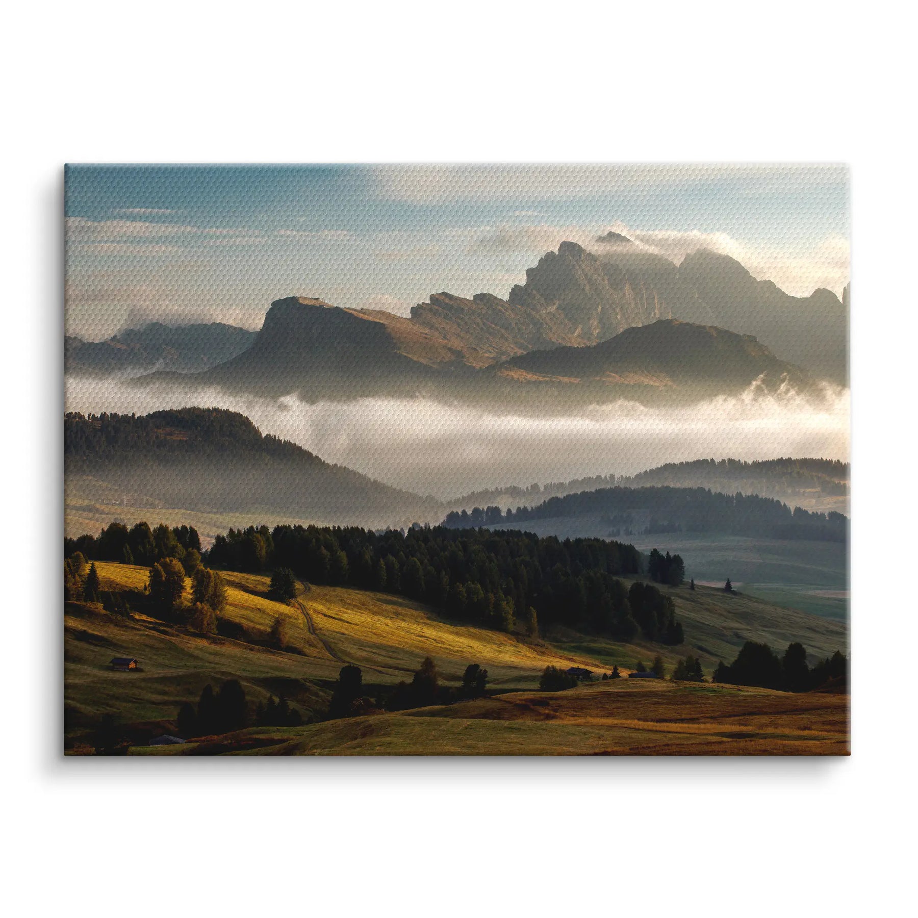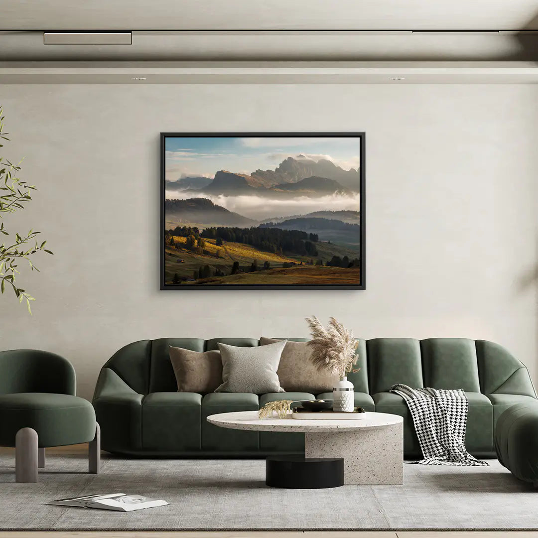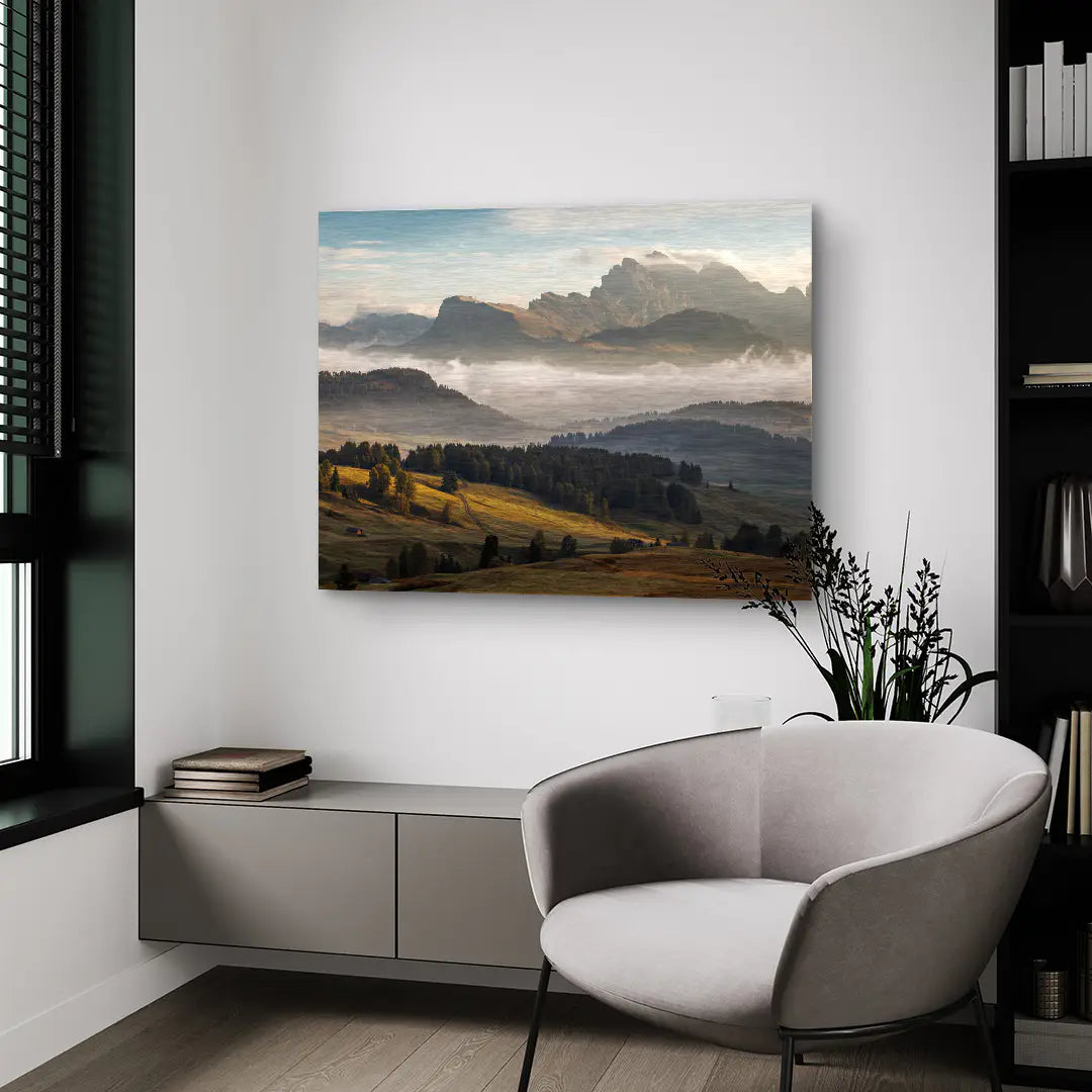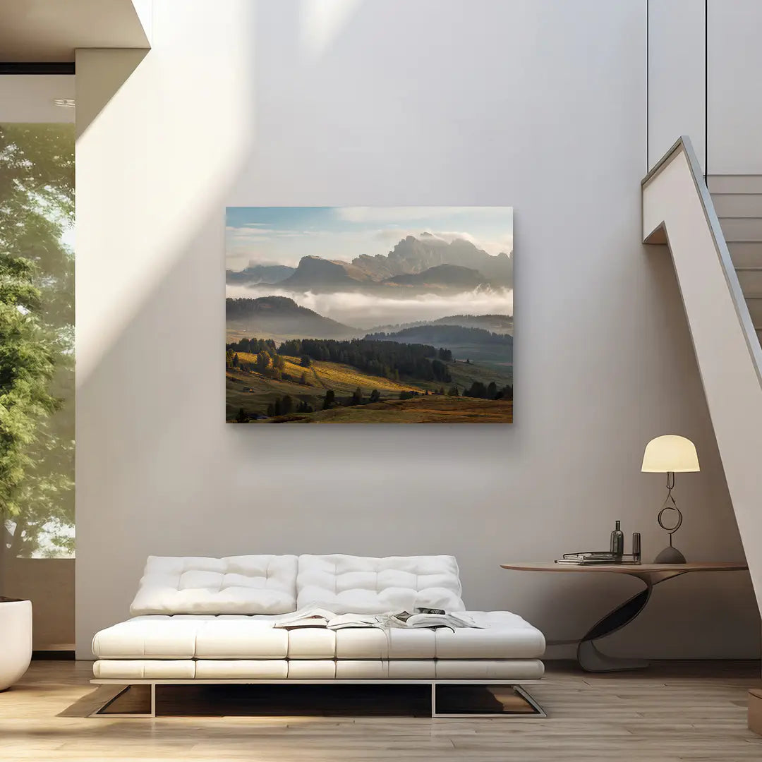 Golden Range von ArtMind eröffnet den Blick auf eine majestätische Berglandschaft im sanften Licht des Morgens. Weite Hügel in warmen Gold und Grüntönen führen den Blick hinauf zu imposanten Gipfeln, die sich kraftvoll über einem Meer aus Nebel erheben. Das Zusammenspiel aus Licht, Schatten und natürlicher Tiefe verleiht diesem Fine Art Wandbild eine eindrucksvolle Ruhe und zugleich eine erhabene Präsenz.