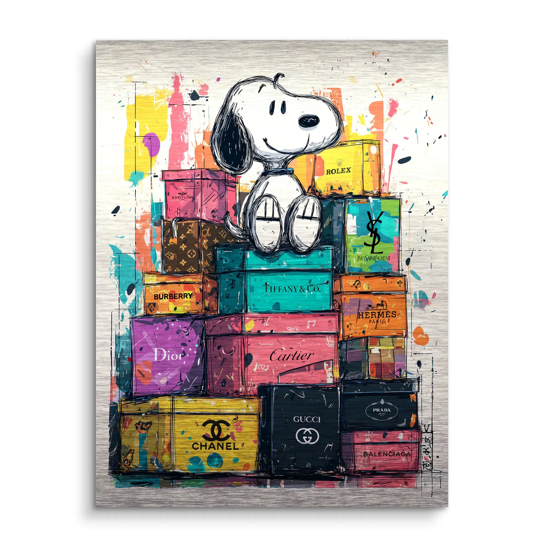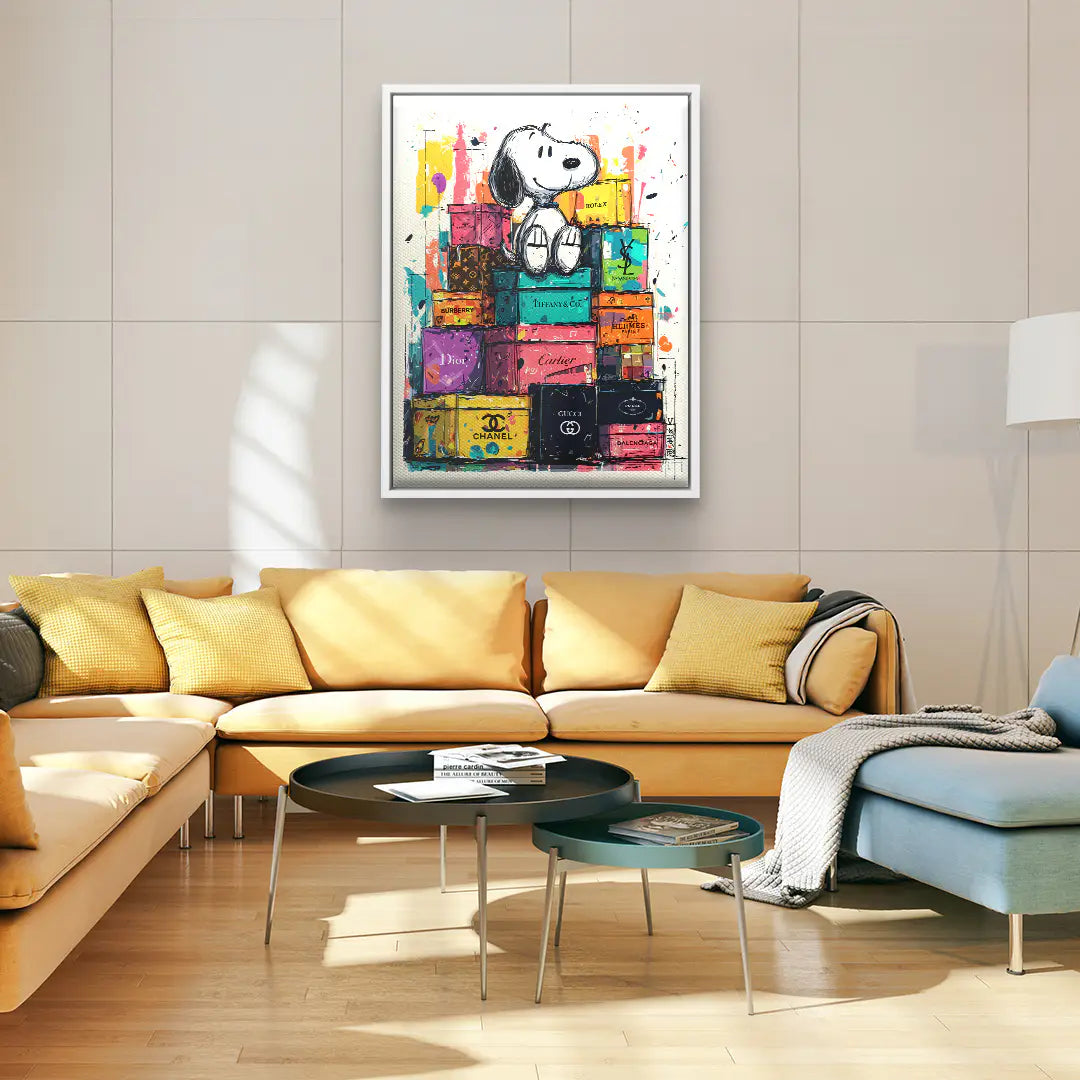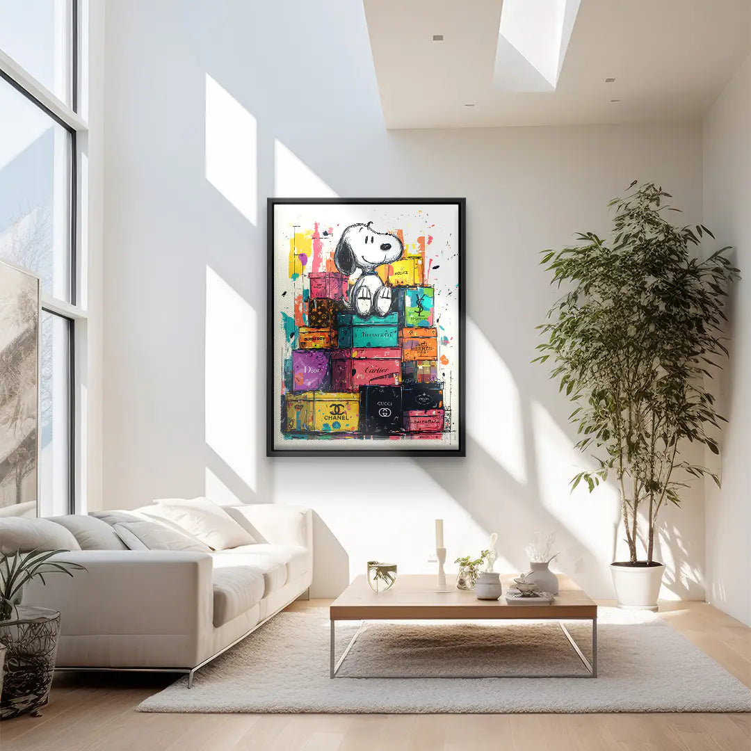 Das Kunstwerk High Life von ArtMind verbindet ikonische Popkultur mit luxuriöser Ästhetik zu einem modernen Fine Art Wandbild mit starker Präsenz. Im Mittelpunkt sitzt eine zeitlose Comic Figur entspannt auf einem Stapel exklusiver Design Boxen. Umgeben von kräftigen Farben und dynamischen Spritzern entsteht eine lebendige Komposition, die Leichtigkeit, Erfolg und urbanen Lifestyle ausstrahlt. Dieses Kunstwerk spielt bewusst mit Kontrasten zwischen kindlicher Unbeschwertheit und hochwertiger Luxuswelt und wird so zum stilvollen Blickfang für moderne Wohnräume, Offices oder kreative Umgebungen.