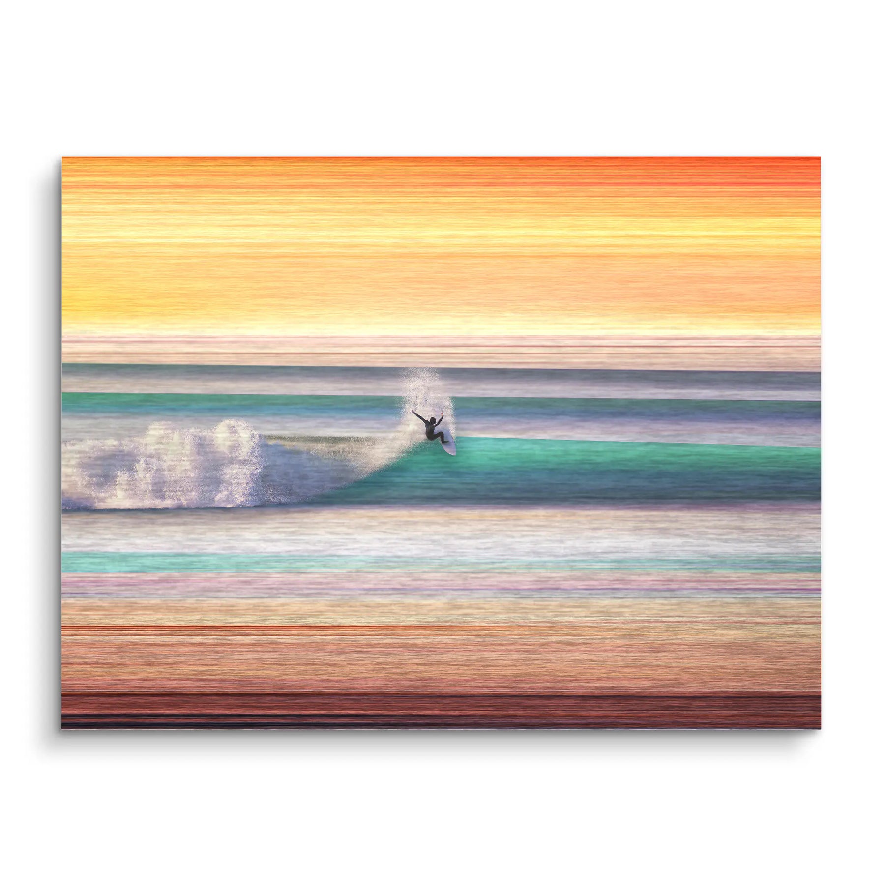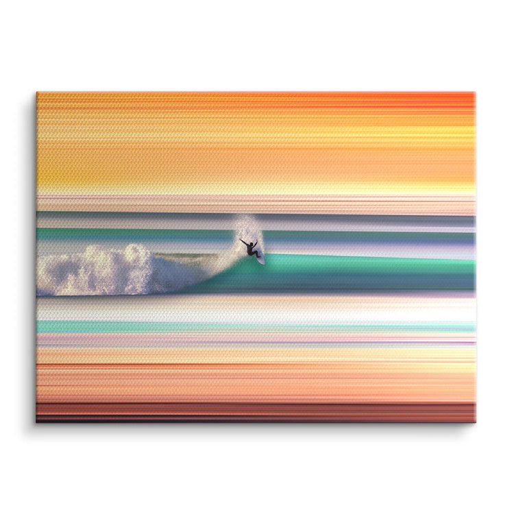 Auf Leinwand entfalten die leuchtenden Farbstreifen ihre volle Wärme und Lebendigkeit. Acrylglas bringt das strahlende Türkis der Welle besonders klar und tief zur Geltung, und Alu Brushed setzt die intensive Farbwelt des Motivs in einem modernen, klaren Rahmen in Szene.