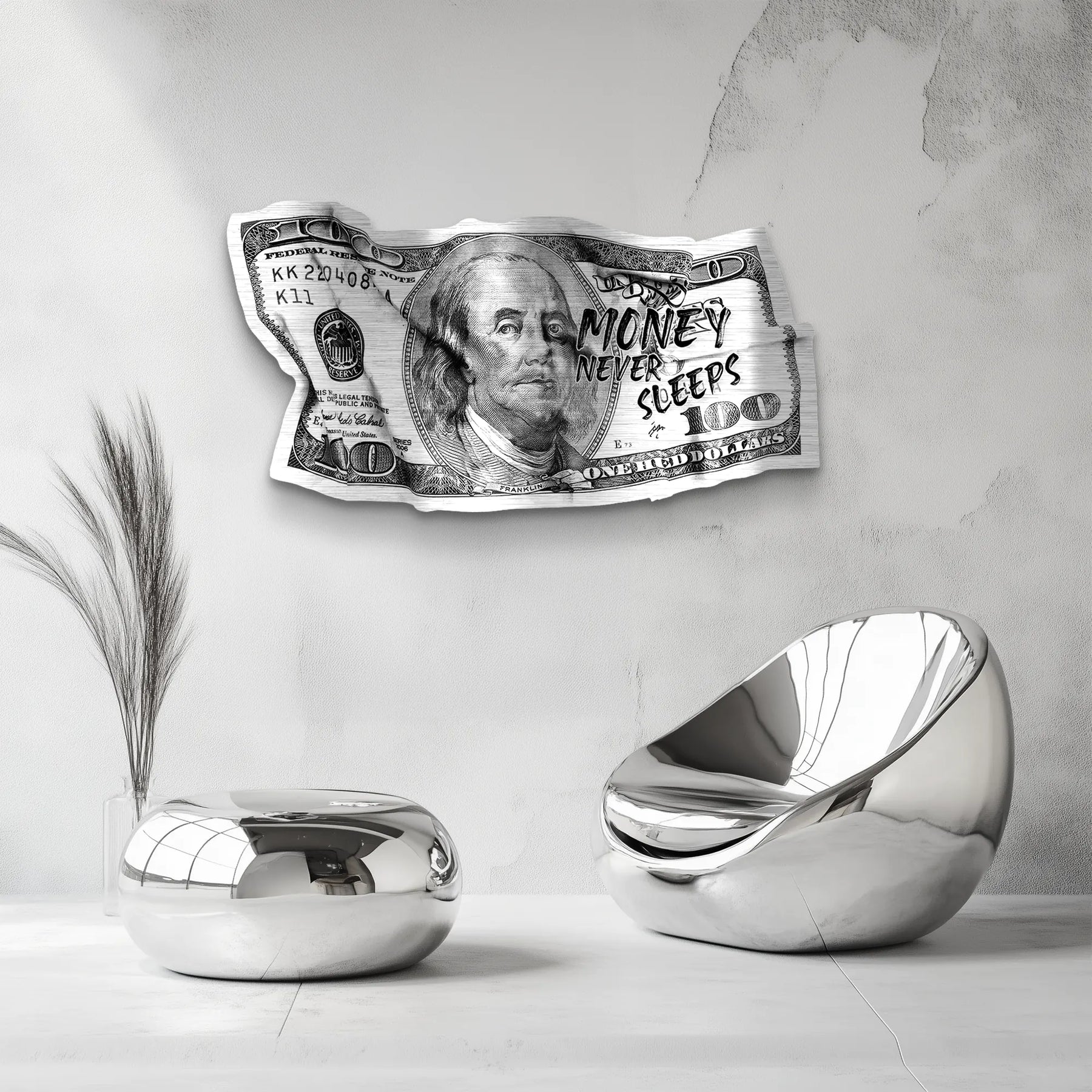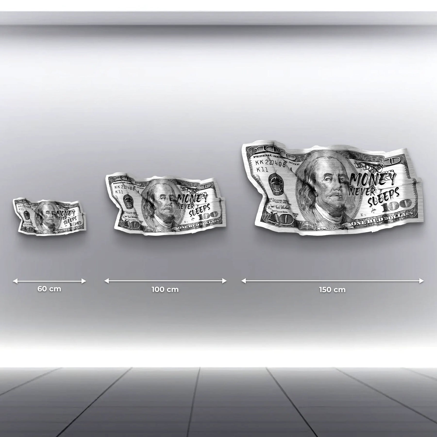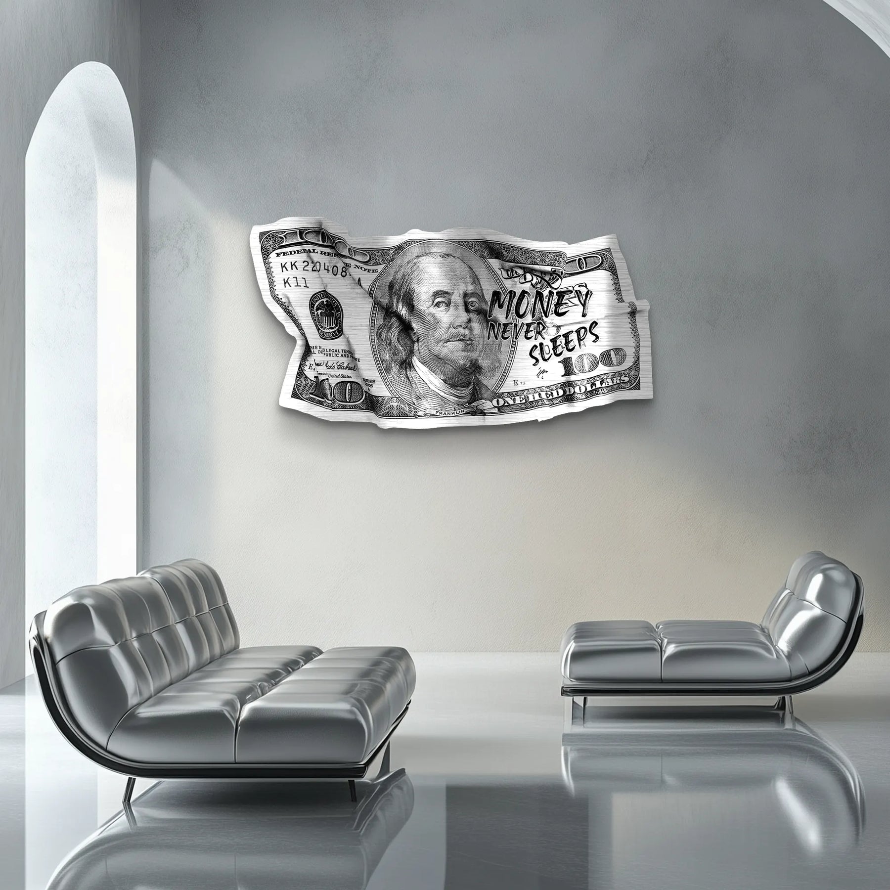 Werk-Beschreibung: Eine moderne Neuinterpretation des ikonischen 100-Dollar-Scheins, versehen mit der markanten Botschaft „Money Never Sleeps“. Ein starkes, urbanes Statement über Drive, Fokus und den unaufhaltsamen Rhythmus des Erfolgs.