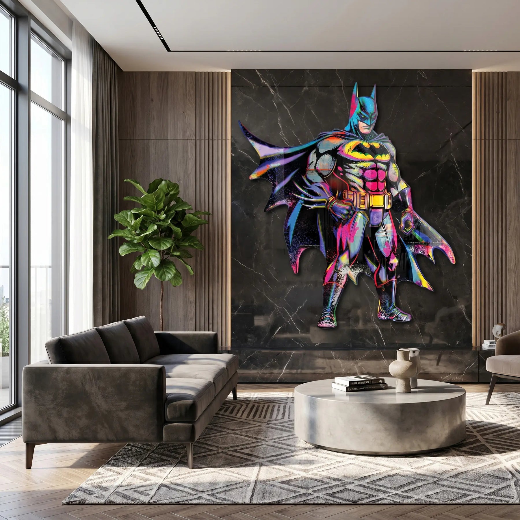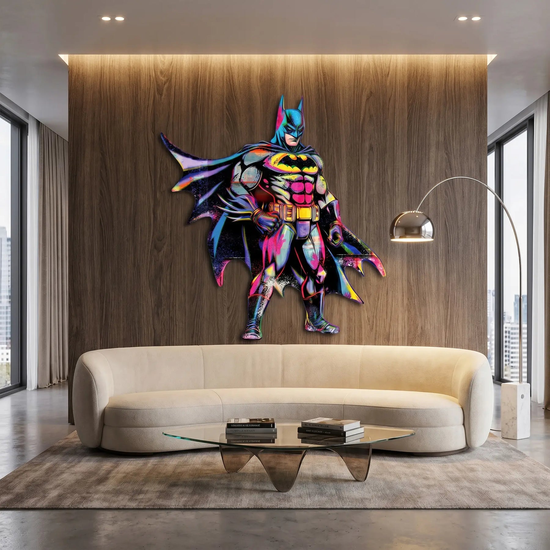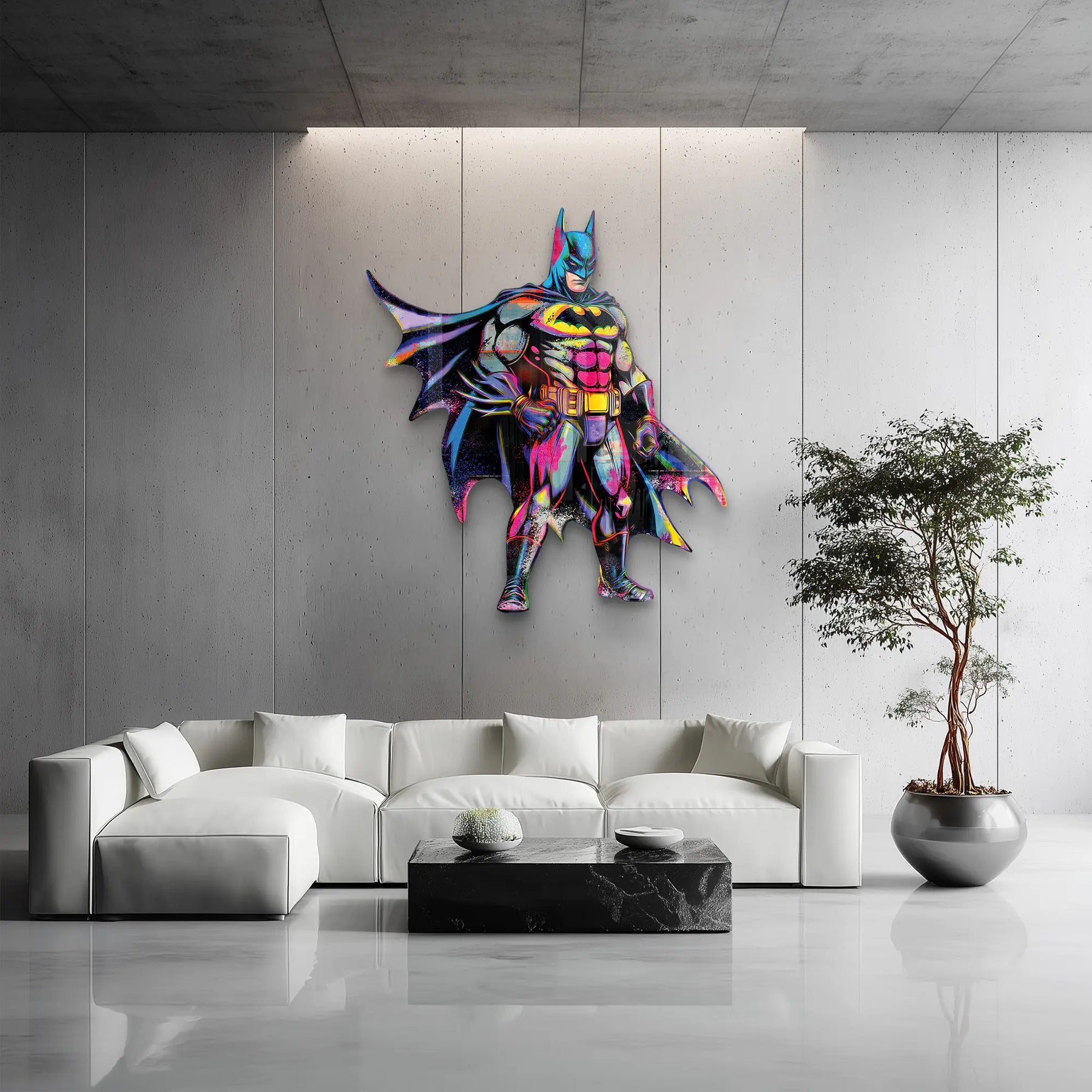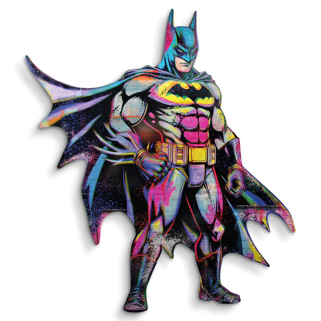 Kraft, Farbe und ikonische Präsenz. Neon Knight zeigt Batman in voller Pose, den Umhang weit ausgebreitet, die Faust geballt. Über das dunkle Kostüm mit dem markanten Bat-Symbol auf der Brust legen sich leuchtende Neonfarben in Pink, Blau, Gelb und Orange, aufgetragen wie Farbspritzer und Pinselzüge eines Street Art Künstlers.