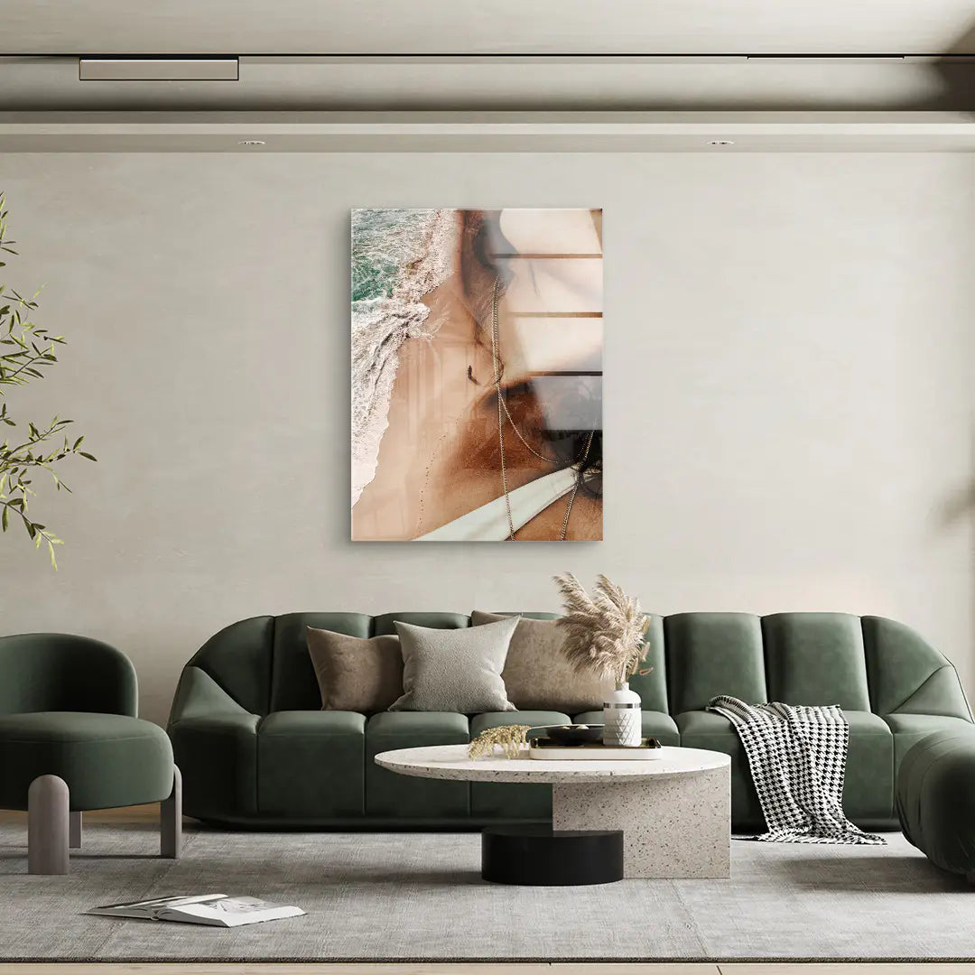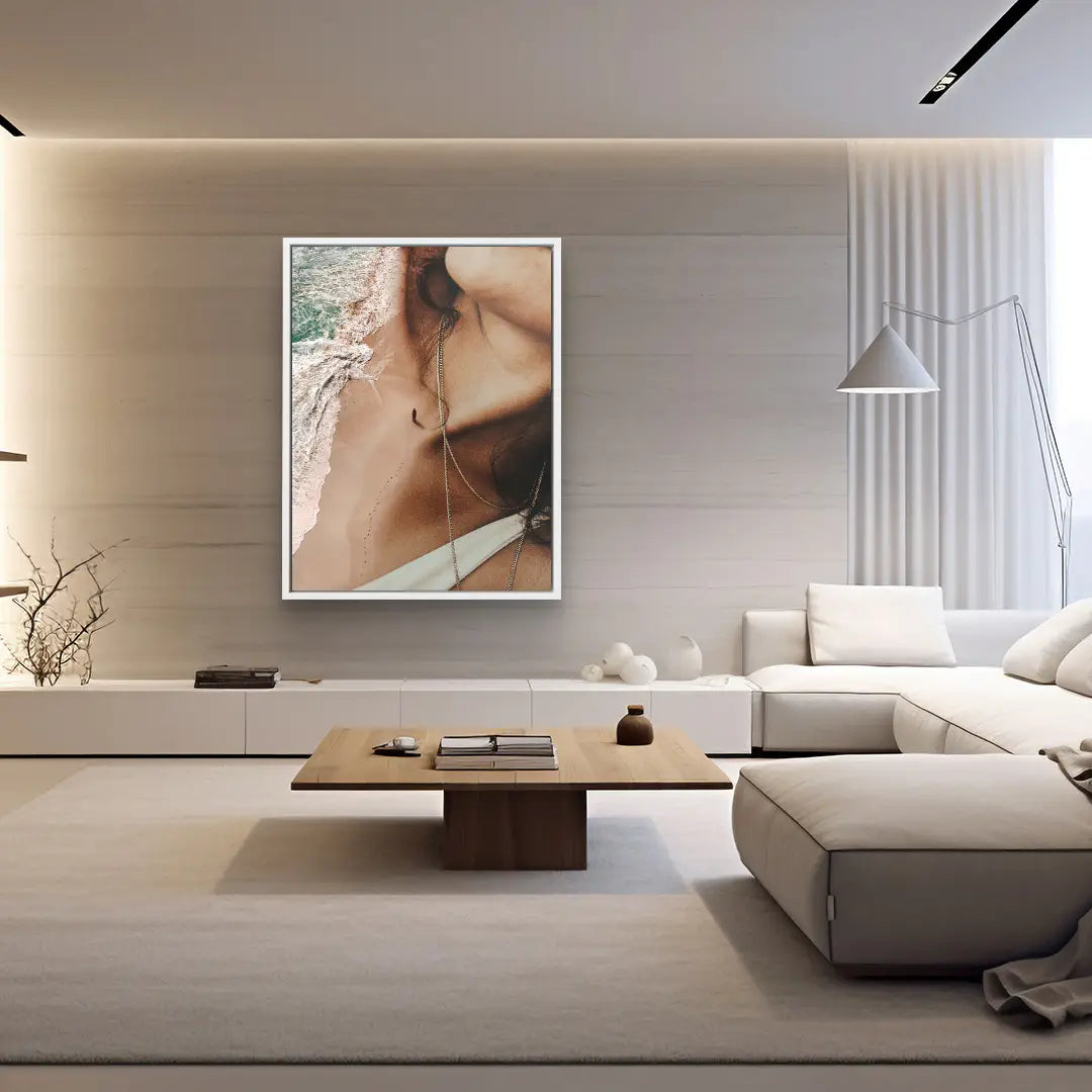 Das Zusammenspiel aus Hauttönen, türkisfarbenem Wasser und weichen Lichtverläufen erzeugt eine warme, intime Atmosphäre. Die feinen Details – von der zarten Kette bis zur Struktur des Sandes – verleihen dem Kunstwerk Tiefe und Eleganz. Ocean Whisper steht für Verbundenheit, Achtsamkeit und die stille Kraft des Moments. Es erinnert daran, wie eng wir mit der Natur verwoben sind – körperlich wie emotional.