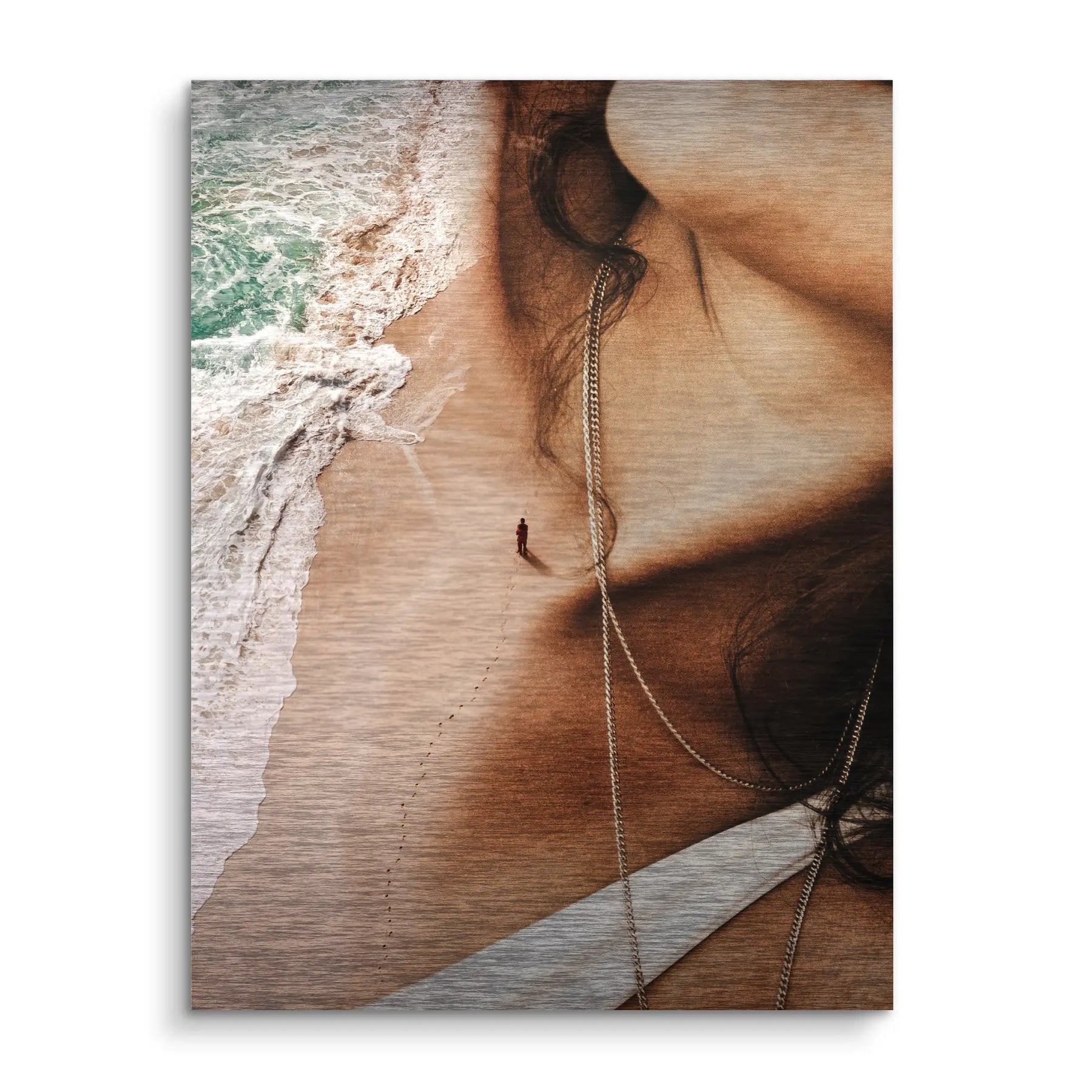 Ocean Whisper von Egzon Muliqi ist eine sinnliche Verschmelzung von Mensch und Natur. Die sanfte Linie einer weiblichen Silhouette geht fließend in eine Meeresküste über, während Wellen wie ein leiser Atemzug auf warmen Sand treffen. Ein winziger Spaziergänger am Strand verstärkt die surreale Dimension des Werks und eröffnet eine poetische Perspektive zwischen Nähe und Unendlichkeit.