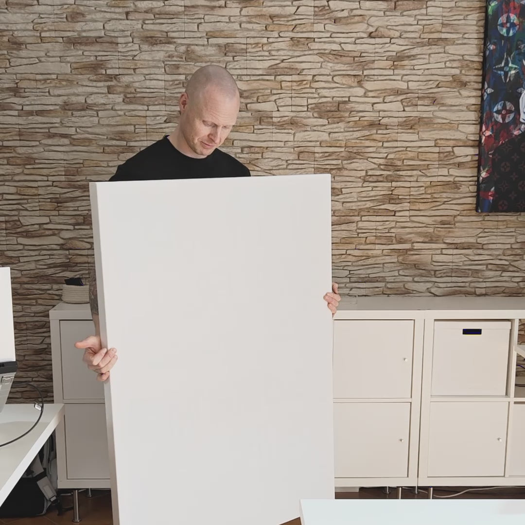 Leinwände lassen sich dank der Vertiefung im Holzrahmen ganz einfach mit Schrauben oder Nägeln an die Wand hängen. Alle anderen Materialien kommen mit einer Aluminium-Galerie-Aufhängung, die du mühelos auf der Rückseite anbringst. Die passende Anleitung erhältst du vorab per E-Mail oder kannst sie hier herunterladen.