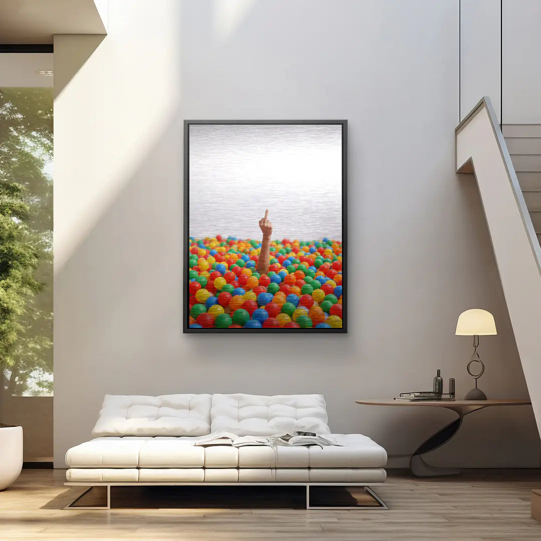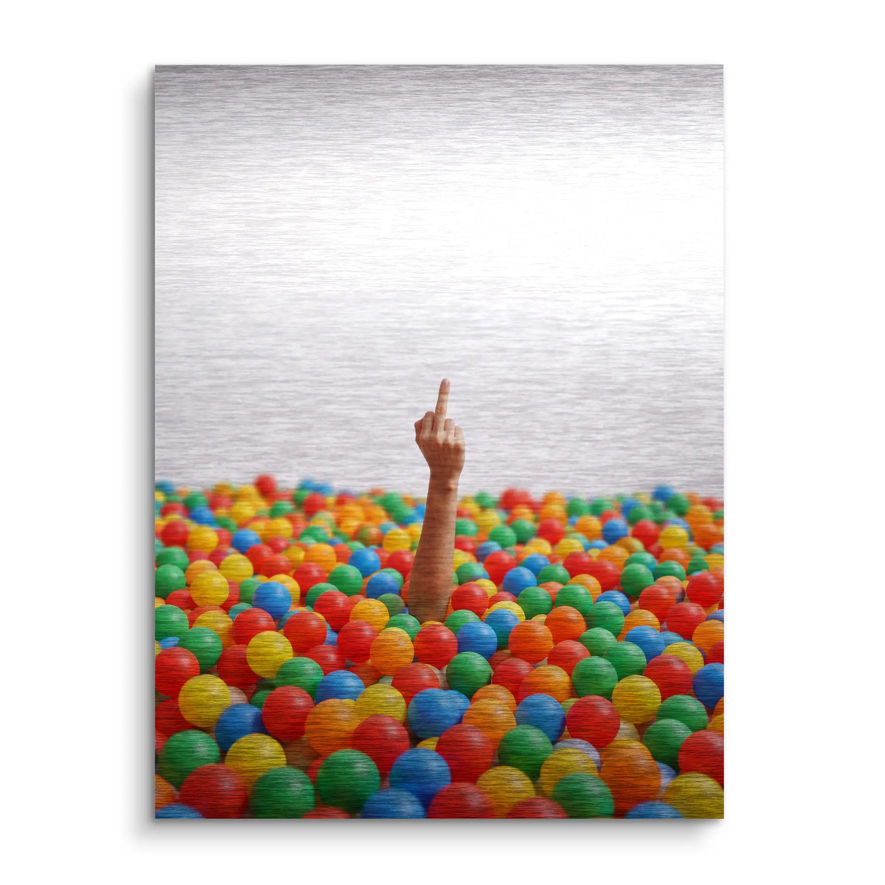 Farbe, Chaos und ein klares Statement. Rebel Playground zeigt ein Meer aus bunten Bällen in Rot, Gelb, Grün, Blau und Orange, aus dem ein einzelner Arm ragt und den Mittelfinger in die Höhe streckt. Der schlichte weiße Hintergrund lässt die Explosion aus Farbe und Geste umso direkter wirken.